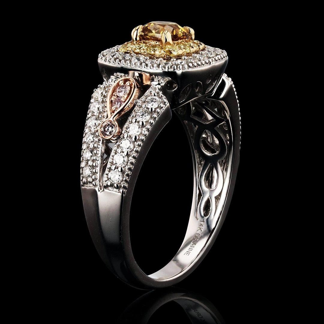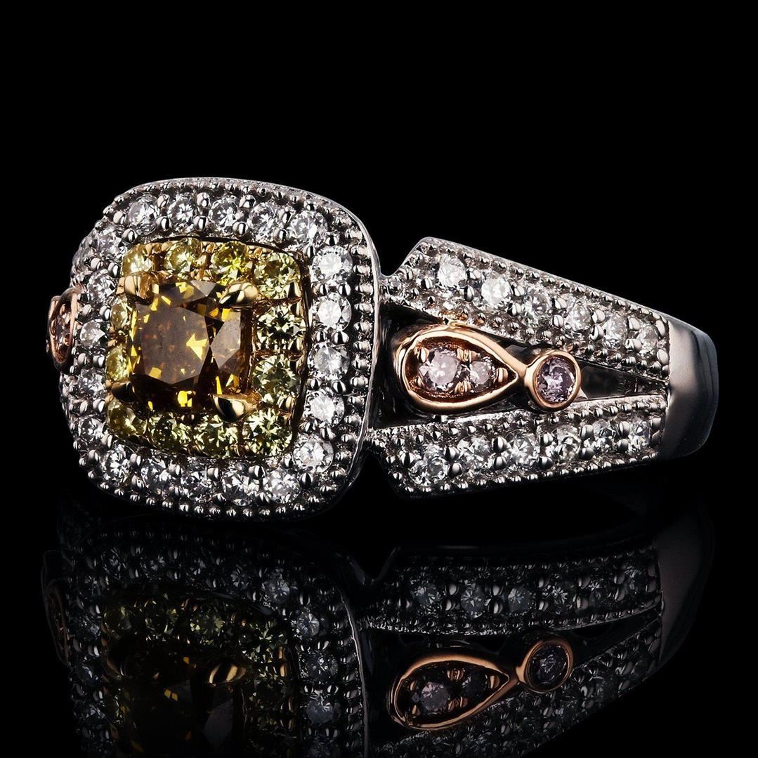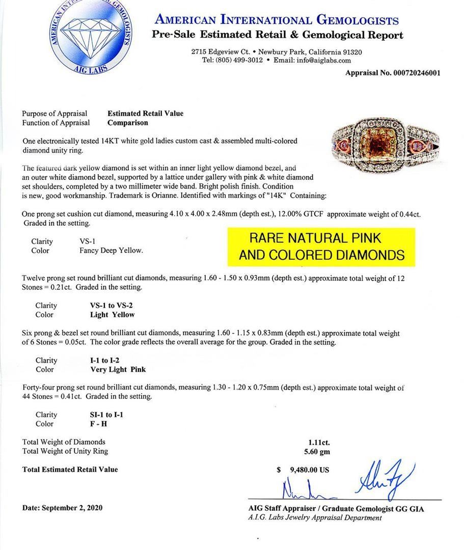 One electronically tested 14KT white gold ladies custom cast & assembled multi-colored diamond unity ring. The featured dark yellow diamond is set within an inner light yellow diamond bezel, and an outer white diamond bezel, supported by a lattice under