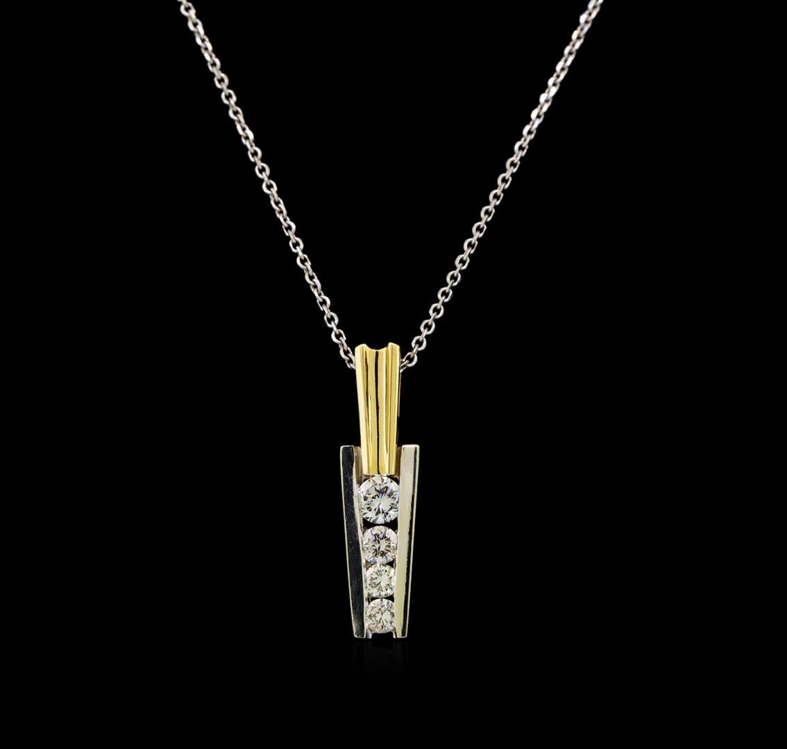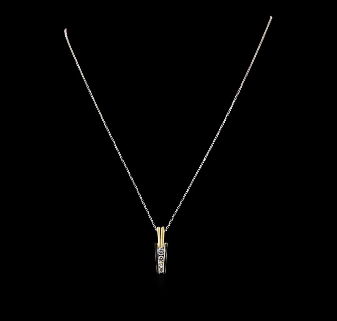 One electronically tested 14KT white and yellow gold lady's combination cast & assembled fashion pendant & chain 18.0' long, 1.3mm diamond cut oval cable link with a spring ring clasp with a bright polish finish. Identified with markings of '14K'. Condition is new, good workmanship. Containing: Two channel set round brilliant cut diamonds, measuring 2.80 - 2.70 x 1.71mm (depth est.) approximate total weight of 2 Stones = 0.16ct. Graded in the setting. Clarity VS-2. Color: H - I Cut Good One channel set round brilliant cut diamond, measuring 3.00 - 2.95 x 1.85mm (depth est.) approximate weight of 0.10ct. Graded in the setting. Clarity VS-2. Color: H - I Cut Good One channel set round brilliant cut diamond, measuring 3.70 - 3.65 x 2.20mm (depth est.) approximate weight of 0.18ct. Graded in the setting. Clarity VS-2. Color: H Cut Good. Total Weight of Diamonds 0.44ct.. Total Weight of Pendant & Chain 4.40gm. GAS Appraised at $2,140.00.