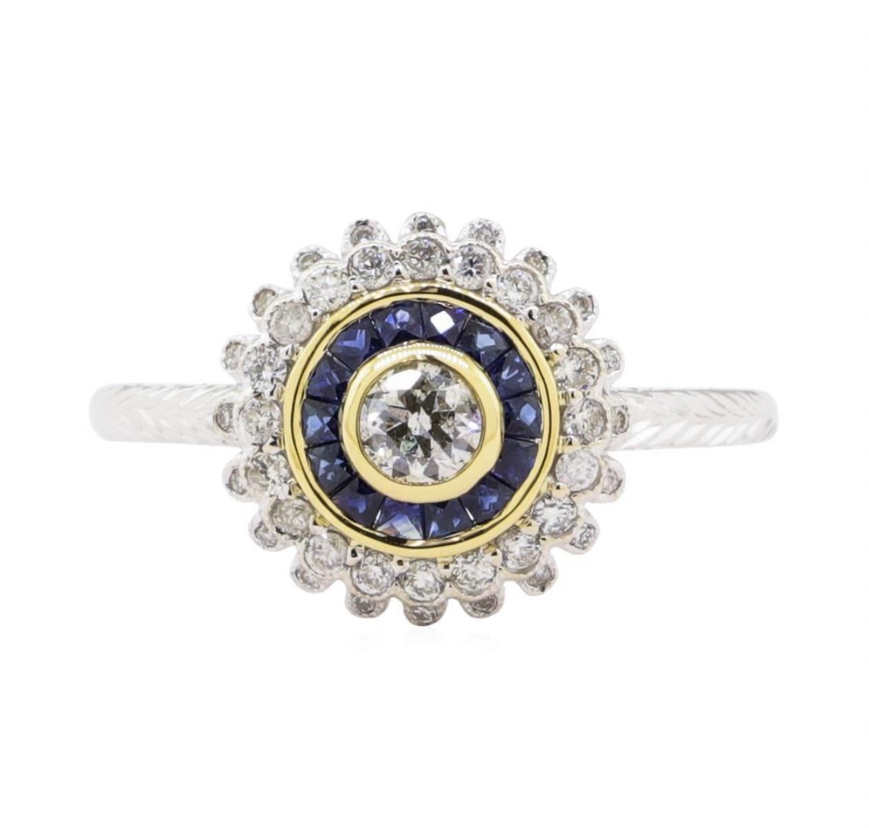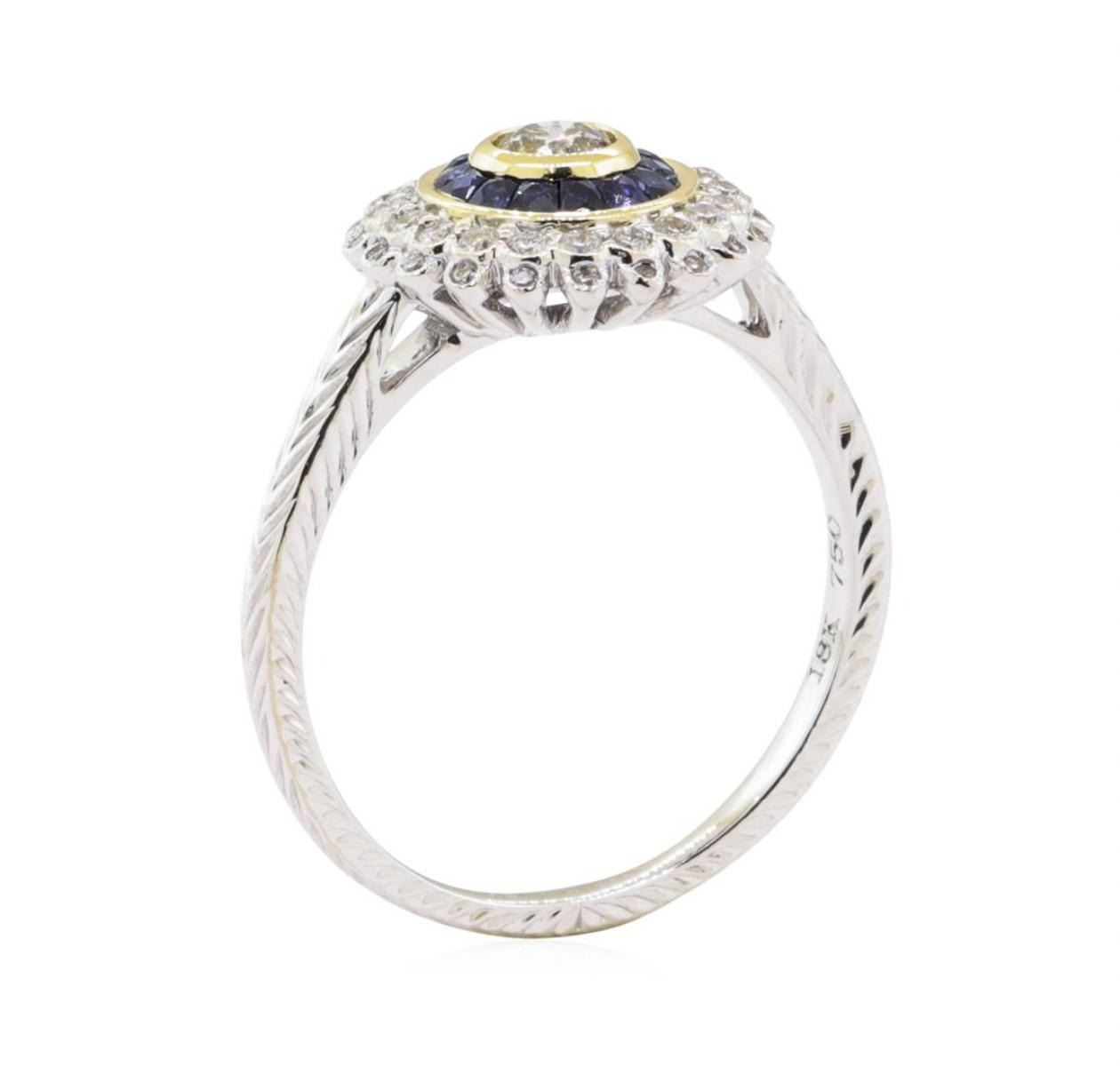 One electronically tested 18KT white & yellow gold ladies cast diamond & sapphire ring. The featured diamond is set within an elaborate sapphire & diamond floral bezel, supported by a ribbed under gallery, completed by a one and one-half millimeter wide band. Bright & patterned finish with milgrain detailing throughout. Trademark is UCG. Identified with markings of "18K 750". Condition is new, good workmanship. Containing: Fourteen channel set square cut natural blue sapphires, measuring 1.40 x 1.40 x 0.91mm, approximate total weight of 0.36ct., clarity is eye clean, type II, dark, moderately strong, violetish blue color, (GIA vB 7/4), cut is good. Transmitting light with no distortion, transparent. Graded in the setting. One bezel set round brilliant cut diamond, measuring 3.80 - 3.80 x 2.28mm (depth est.) approximate weight of 0.18ct. Graded in the setting. Clarity I-1 Color H Forty bead & bezel set round brilliant cut diamonds, measuring 1.40 - 0.90 x 0.69mm (depth est.) approximate total weight of 40 Stones = 0.26ct. Graded in the setting. Clarity SI-1 to I-1 Color F - H Total Weight of Colored Stones 0.36 ct. Total Weight of Diamonds 0.44 ct. Total Weight of Ring 3.30 gm Estimated Retail Value $ 2,800.00 US