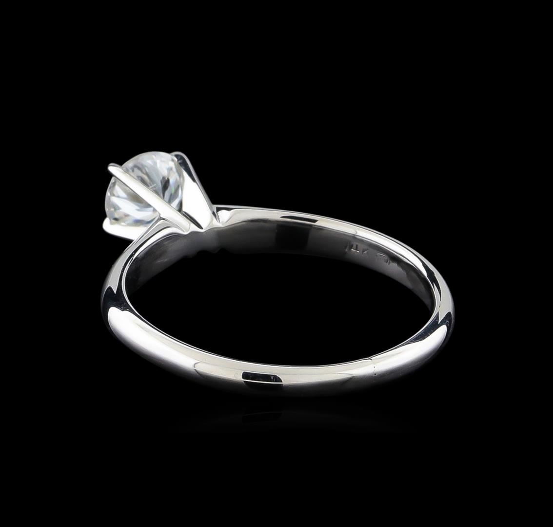 One electronically tested 14KT white gold ladies cast diamond solitaire ring with a bright polish finish. The featured diamond is completed by a one millimeter wide band. Identified with markings of "14K". Condition is new, good workmanship. Containing: One prong set round brilliant cut diamond, measuring 4.90 - 4.90 x 3.00mm (depth est.) approximate weight of 0.44ct, laser drilled. Graded in the setting. Clarity: I-1. Color: F. Depth 61.2%. Table 61.2%. Total Weight of Diamonds 0.44ct. Total Weight of Ring 2.00gm. AIG Appraised at $2,115.00.
