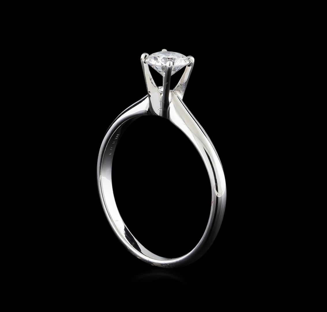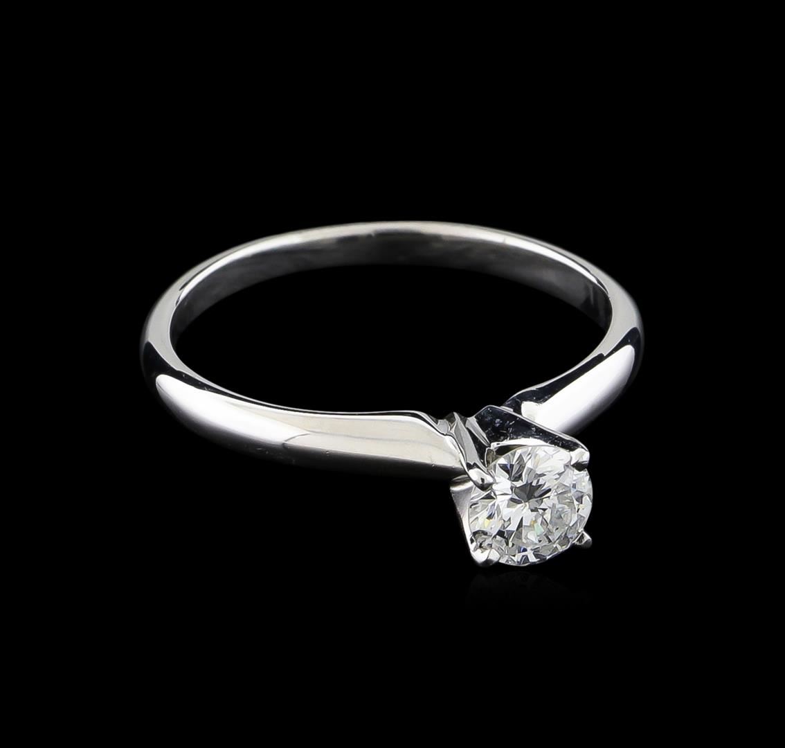 One electronically tested 14KT white gold ladies cast diamond solitaire ring with a bright polish finish. The featured diamond is completed by a one millimeter wide band. Identified with markings of "14K". Condition is new, good workmanship. Containing: One prong set round brilliant cut diamond, measuring 4.90 - 4.90 x 3.00mm (depth est.) approximate weight of 0.44ct, laser drilled. Graded in the setting. Clarity: I-1. Color: F. Depth 61.2%. Table 61.2%. Total Weight of Diamonds 0.44ct. Total Weight of Ring 2.00gm. AIG Appraised at $2,115.00.