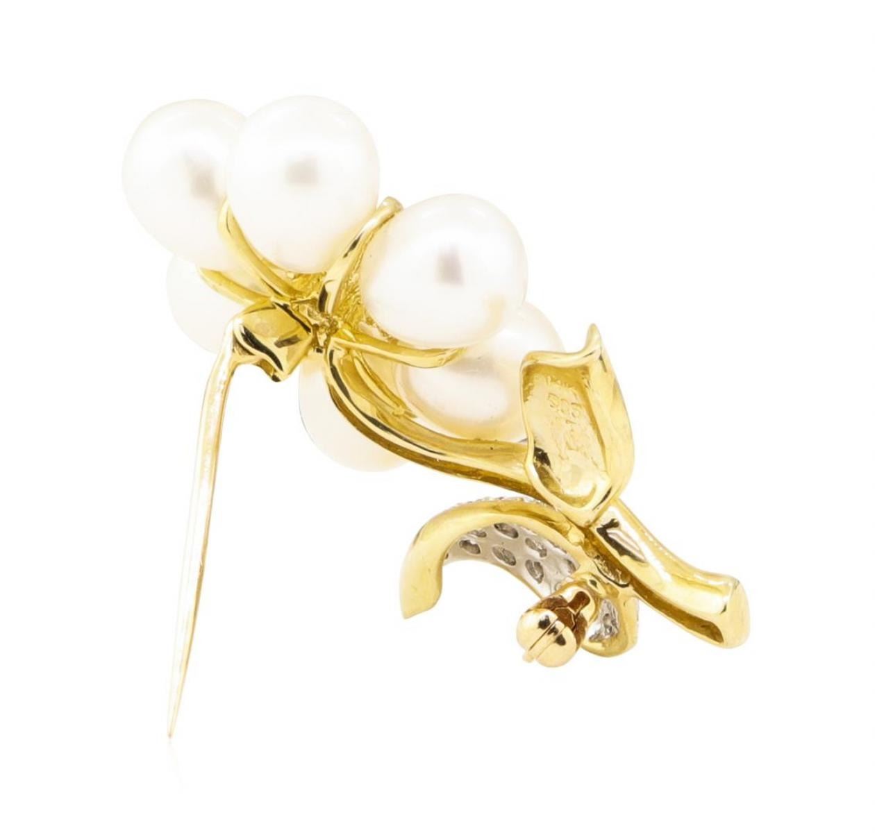 One electronically tested 14KT yellow gold lady's combination cast & assembled fashion floral design pin with a bright polish finish. The featured pin has a length of approximately thirty-six millimeters. Identified with markings of '14K'. Condition is new, good workmanship. Containing: Six chinese freshwater pearls, 8.6mm to 7.0mm in size. The pearls are white in color with a good luster, off round, and mostly clean with very good matching. Graded in the setting. One prong set round brilliant cut diamond, measuring 2.90 - 2.85 x 1.79mm (depth est.) approximate weight of 0.09ct. Graded in the setting. Color I Clarity I-1 Cut Good Twenty-Six prong set round brilliant cut diamonds, measuring 1.55 - 1.50 x 0.95mm (depth est.) approximate total weight of 26 Stones = 0.35ct. Graded in the setting. Color H - I Clarity SI-1 to I-1 Cut Good. Total Weight of Diamonds 0.44ct.. Total Weight of Pin 7.40gm GAS Appraised at $2820.00. GAS Appraised.