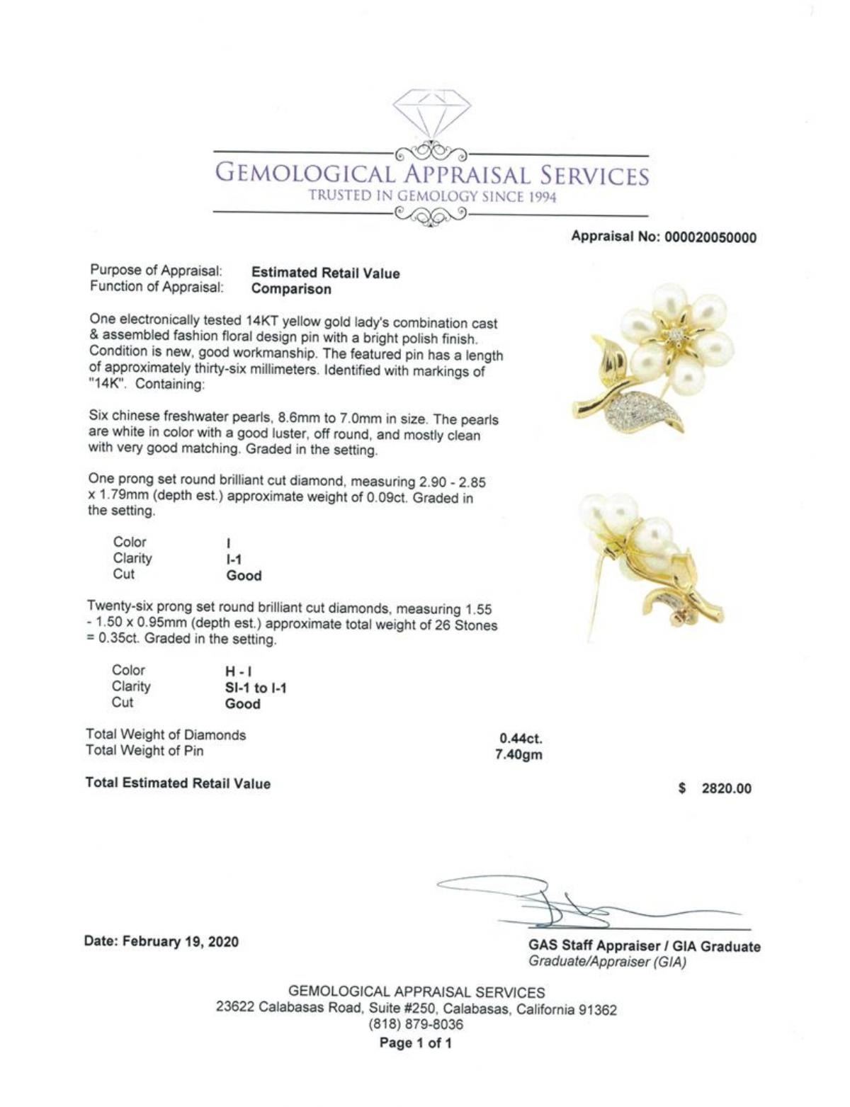 One electronically tested 14KT yellow gold lady's combination cast & assembled fashion floral design pin with a bright polish finish. The featured pin has a length of approximately thirty-six millimeters. Identified with markings of '14K'. Condition is new, good workmanship. Containing: Six chinese freshwater pearls, 8.6mm to 7.0mm in size. The pearls are white in color with a good luster, off round, and mostly clean with very good matching. Graded in the setting. One prong set round brilliant cut diamond, measuring 2.90 - 2.85 x 1.79mm (depth est.) approximate weight of 0.09ct. Graded in the setting. Color I Clarity I-1 Cut Good Twenty-Six prong set round brilliant cut diamonds, measuring 1.55 - 1.50 x 0.95mm (depth est.) approximate total weight of 26 Stones = 0.35ct. Graded in the setting. Color H - I Clarity SI-1 to I-1 Cut Good. Total Weight of Diamonds 0.44ct.. Total Weight of Pin 7.40gm GAS Appraised at $2820.00. GAS Appraised.