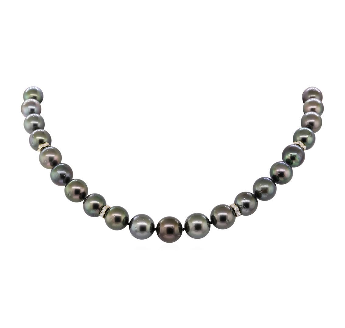 One graduated single strand pearl necklace 18.5' princess length, knotted with a tongue clasp containing 35 Tahitian pearls, 13.7mm to 11.0mm in size. The pearls are black in color, green overtone with a very good luster, round, and mostly clean with very GAS Appraised.