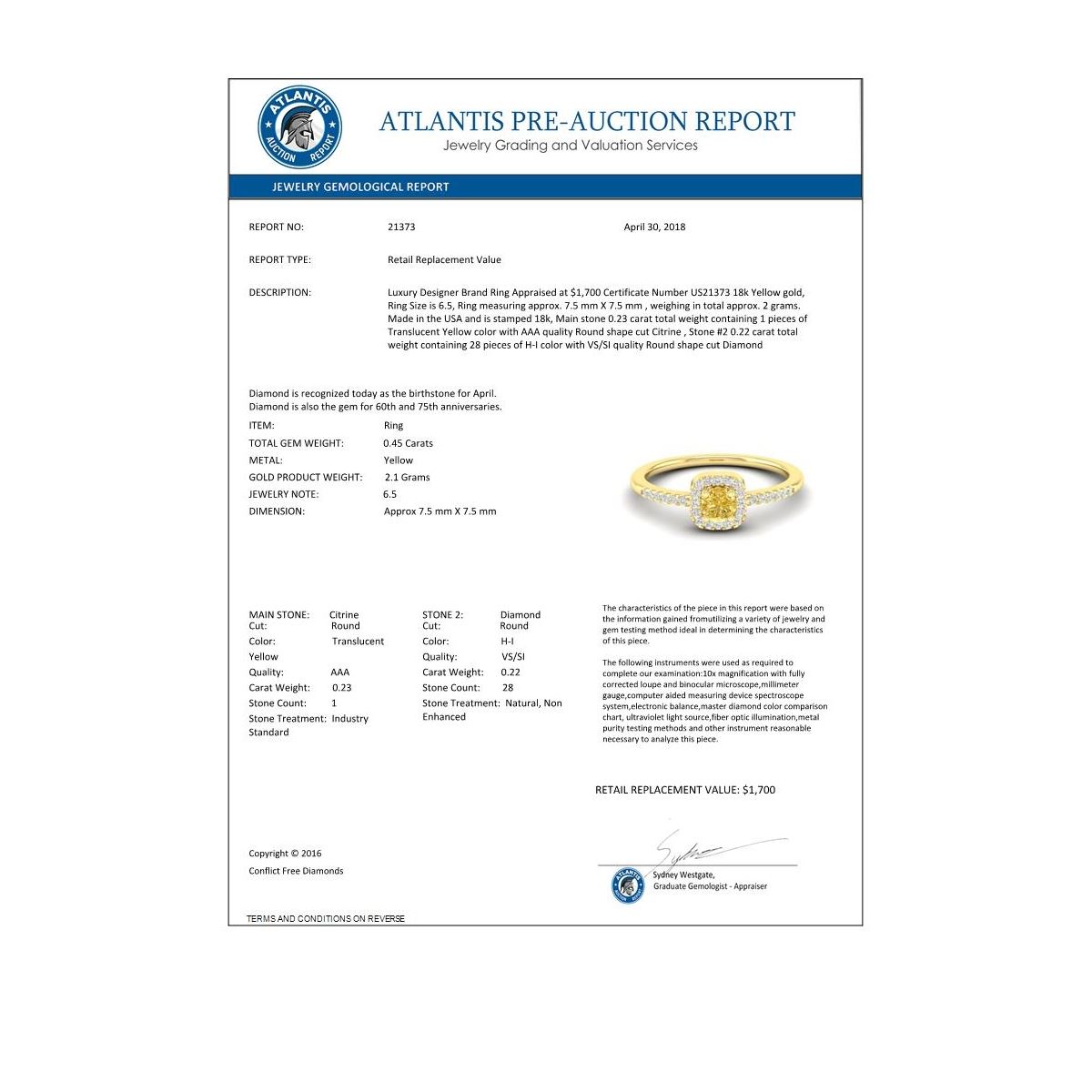 REF-27W8F -21373 ---- 0.45 CTW Citrine & Micro Pave VS/SI Diamond Ring Designer Halo 18K Yellow Gold ---- Luxury Designer Brand Ring Appraised at $1,700 Certificate Number US21373 18k Yellow gold, Ring Size is 6.5, Ring measuring approx. 7.5 mm X 7.5 mm , weighing in total approx. 2 grams. Made in the USA and is stamped 18k, Main stone 0.23 carat total weight containing 1 pieces of Translucent Yellow color with AAA quality Round shape cut Citrine , Stone #2 0.22 carat total weight containing 28 pieces of H-I color with VS/SI quality Round shape cut Diamond