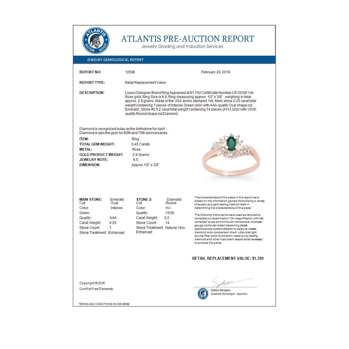 REF-25A8X -12506 ---- 0.45 CTW Emerald & Diamond Ring 14K Rose Gold ---- Luxury Designer Brand Ring Appraised at $1,700 Certificate Number US12506 14k Rose gold, Ring Size is 6.5, Ring measuring approx. 1/2" x 3/8" , weighing in total approx. 2.8 grams. Made in the USA and is stamped 14k, Main stone 0.25 carat total weight containing 1 pieces of Intense Green color with AAA quality Oval shape cut Emerald , Stone #2 0.2 carat total weight containing 14 pieces of H-I color with VS/SI quality Round shape cut Diamond