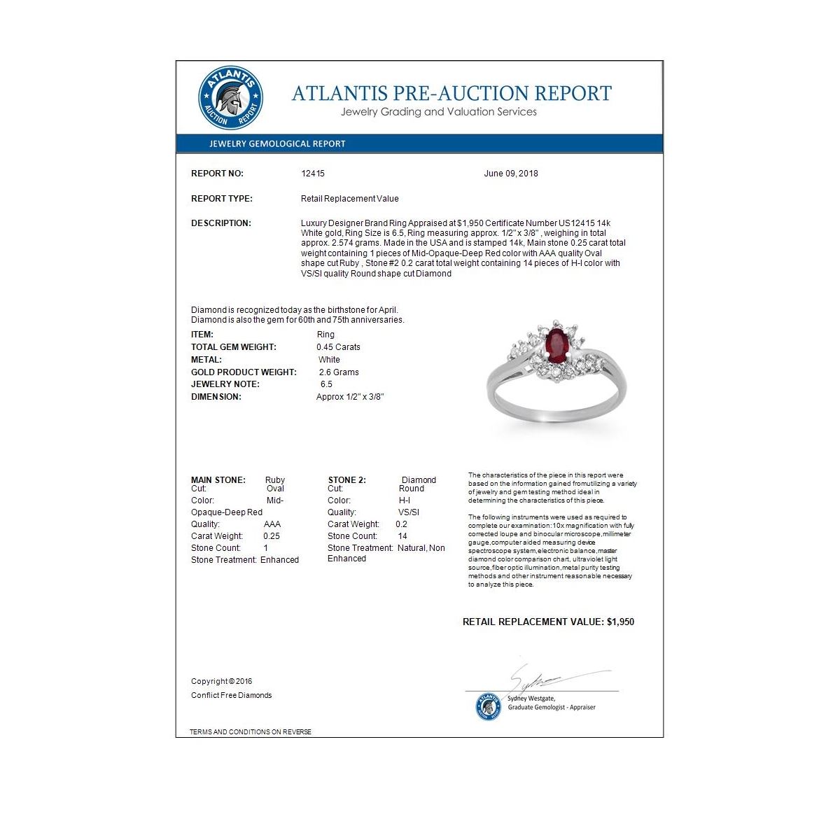 REF-29X8T -12415 ---- 0.45 CTW Ruby & Diamond Ring 14K White Gold ---- Luxury Designer Brand Ring Appraised at $1,950 Certificate Number US12415 14k White gold, Ring Size is 6.5, Ring measuring approx. 1/2" x 3/8" , weighing in total approx. 2.574 grams. Made in the USA and is stamped 14k, Main stone 0.25 carat total weight containing 1 pieces of Mid-Opaque-Deep Red color with AAA quality Oval shape cut Ruby , Stone #2 0.2 carat total weight containing 14 pieces of H-I color with VS/SI quality Round shape cut Diamond