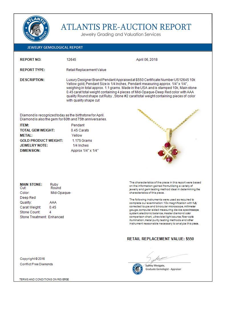 REF-8A6X -12645 ---- 0.45 CTW Ruby Pendant 10K Yellow Gold ---- Luxury Designer Brand Pendant Appraised at $550 Certificate Number US12645 10k Yellow gold, Pendant Size is 1/4 Inches, Pendant measuring approx. 1/4" x 1/4", weighing in total approx. 1.1 grams. Made in the USA and is stamped 10k, Main stone 0.45 carat total weight containing 4 pieces of Mid-Opaque-Deep Red color with AAA quality Round shape cut Ruby , Stone #2 carat total weight containing pieces of color with quality shape cut