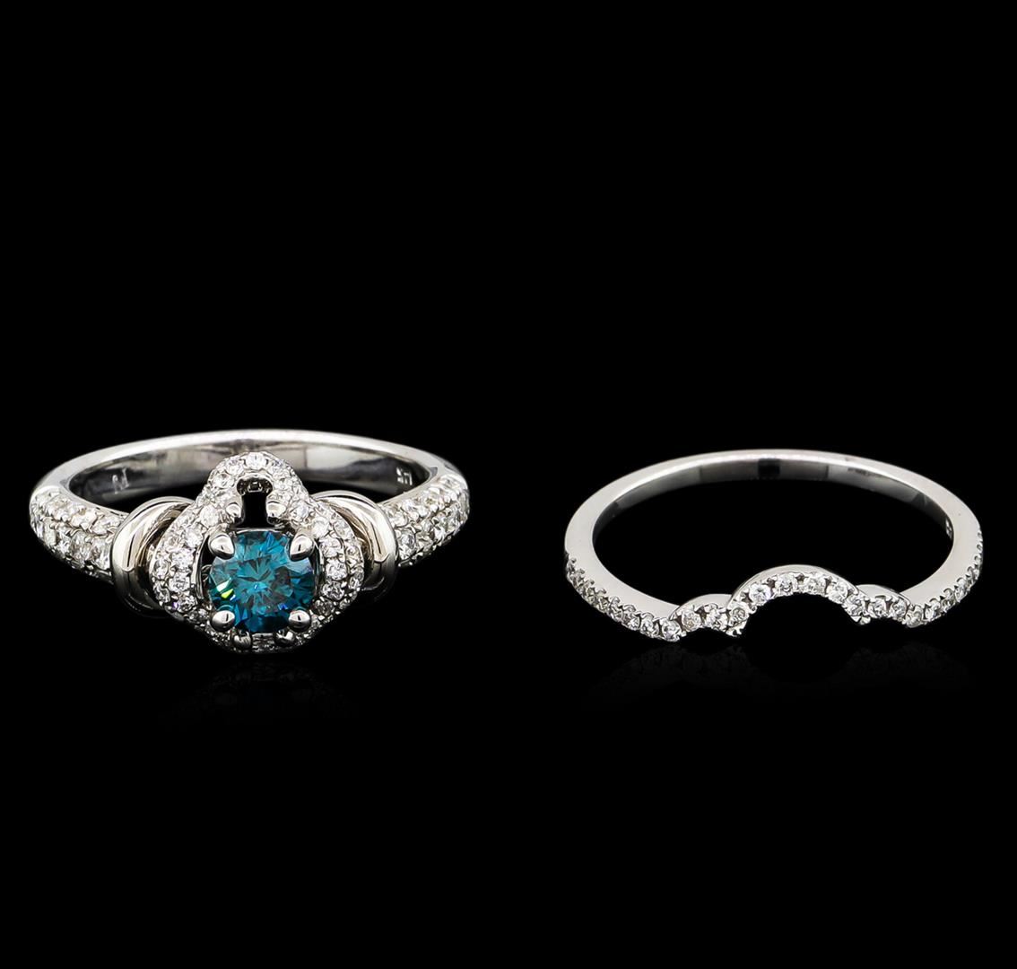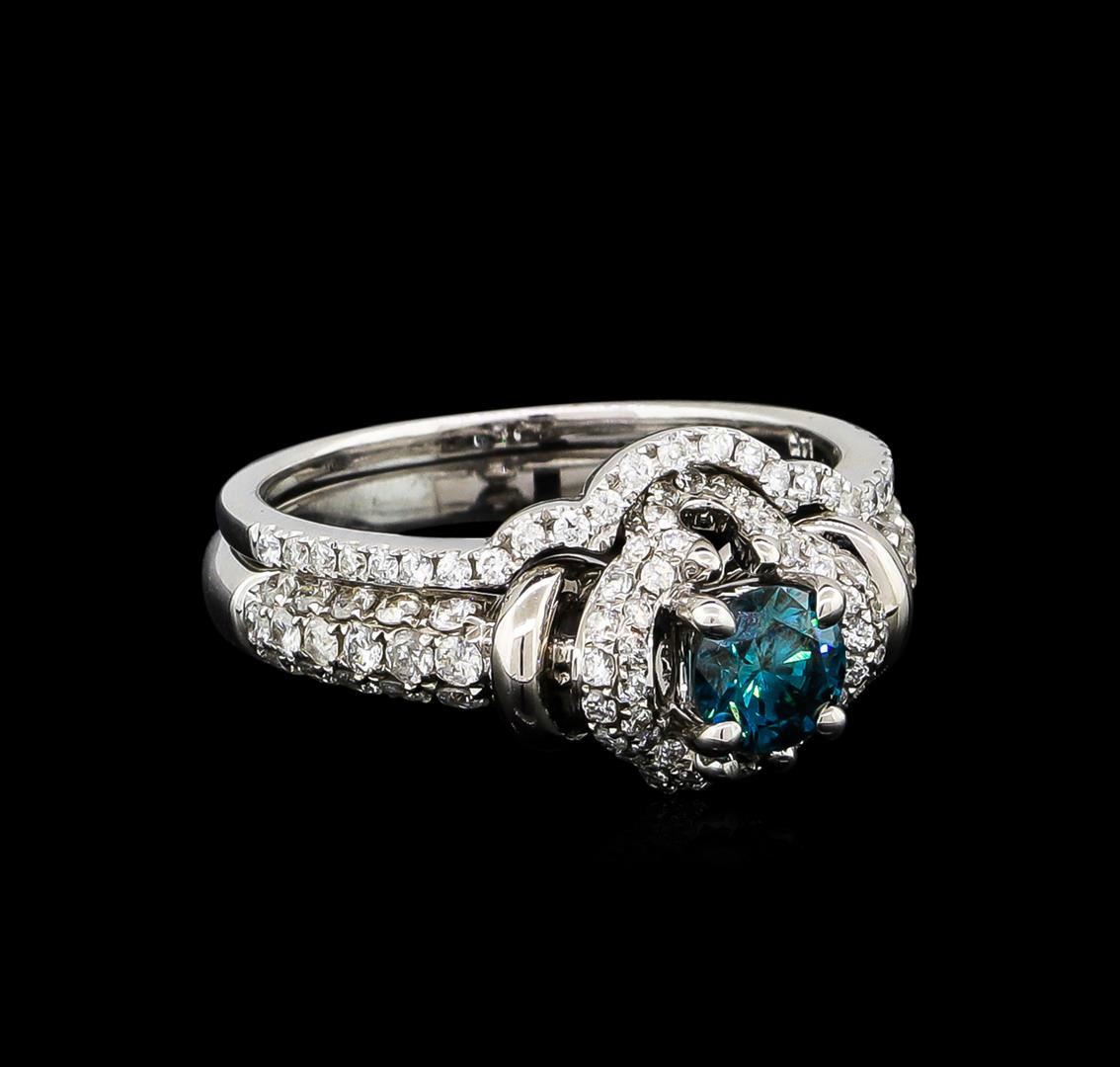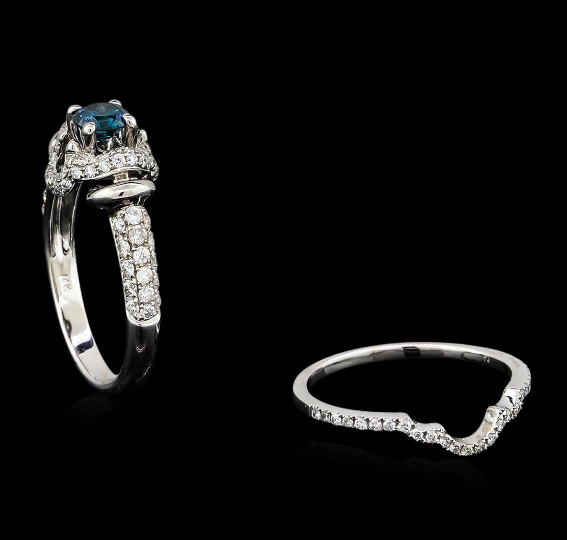One 14k white gold ladies 2-rings set (5.56 gr). Containing: 1 round, brilliant-cut diamond 0.45 ct in weight. The quality: SI3 clarity; fancy dark blue enhanced color. 116 round, brilliant-cut diamonds total 0.76 ct average quality: SI1-SI3 clarity; H color. GLS Appraised at $5,640.00.