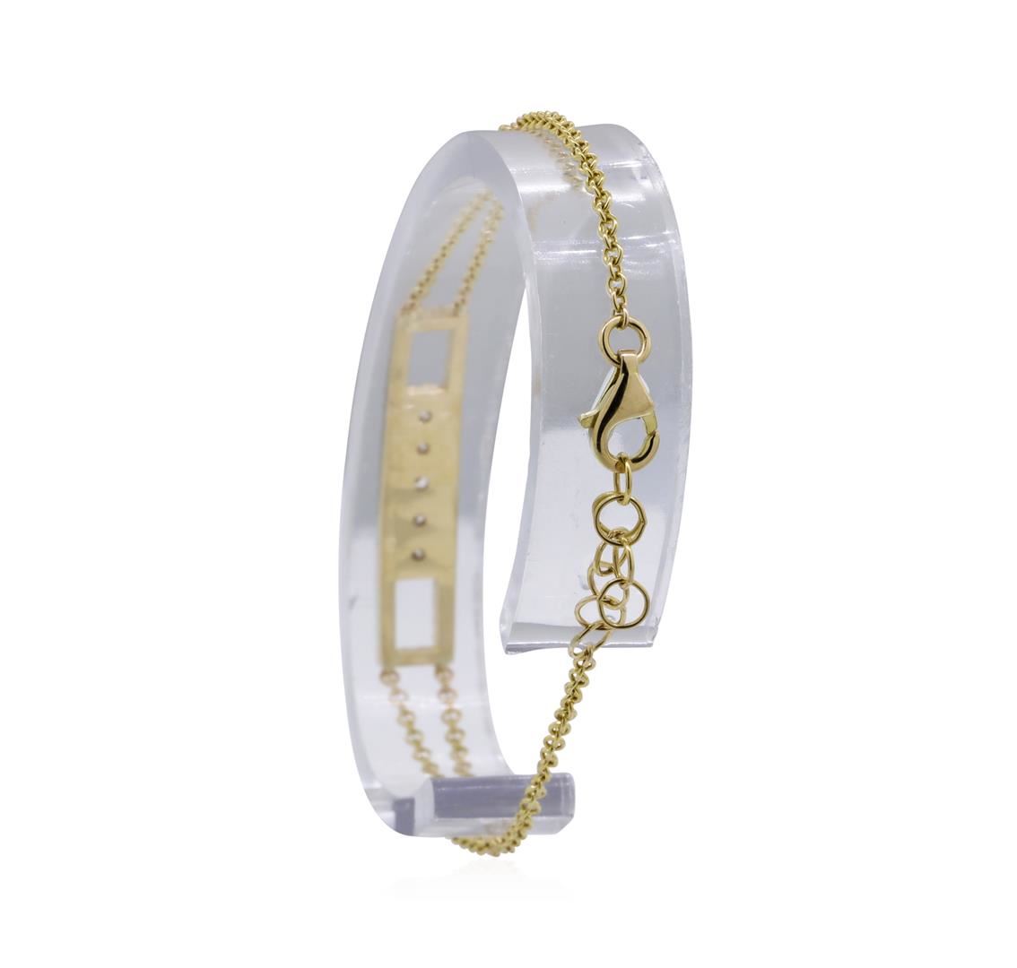 One electronically tested 14KT yellow gold lady's cast fashion bracelet with a lobster claw clasp with a bright polish finish. This featured lady's bracelet can be adjusted from six and a quarter to seven inches in length. Identified with markings of '585'. Condition is new, good workmanship. Containing: Five prong set round brilliant cut diamonds, measuring 3.00 - 2.80 x 1.80mm (depth est.) approximate total weight of 5 Stones = 0.45ct. Graded in the setting. Color H - I Clarity SI-1 to I-1 Cut Good Fifty prong set round brilliant cut diamonds, measuring 1.10 - 1.00 x 0.65mm (depth est.) approximate total weight of 50 Stones = 0.22ct. Graded in the setting. Color H - J Clarity SI-1 to I-1 Cut Good. Total Weight of Diamonds 0.67ct.. Total Weight of Bracelet 3.50gm GAS Appraised at $2225.00. GAS Appraised.