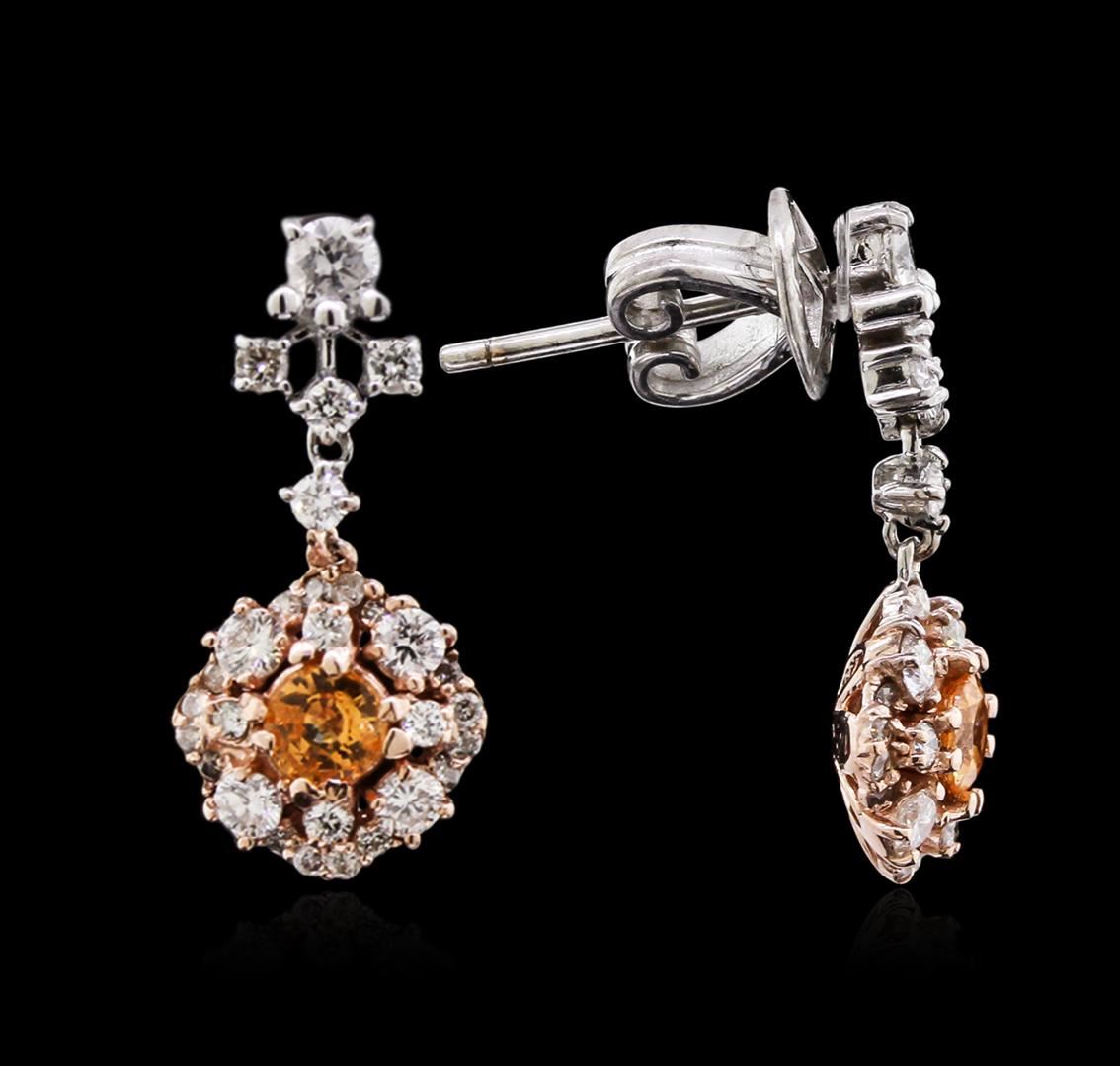 One pair of earrings featuring: 14KT rose and white gold weighing 3.38 grams containing 2 orange sapphires with a total weight of 0.45ct and diamonds with a total weight of 0.79ct.