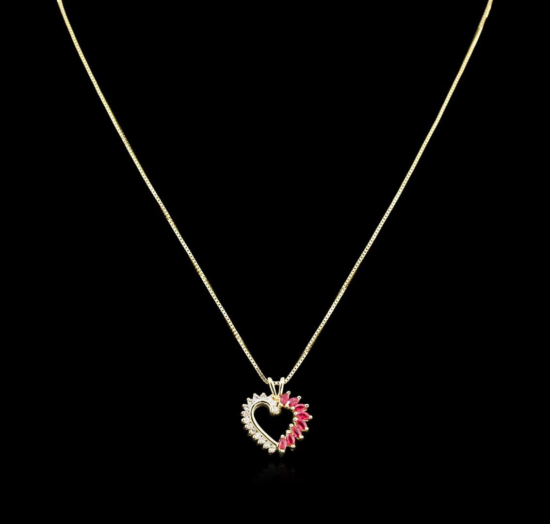 One heart pendant with chain featuring: 14KT yellow gold weighing 2.90 grams containing rubies with a total weight of 0.45ct and diamonds with a total weight of 0.10ct.