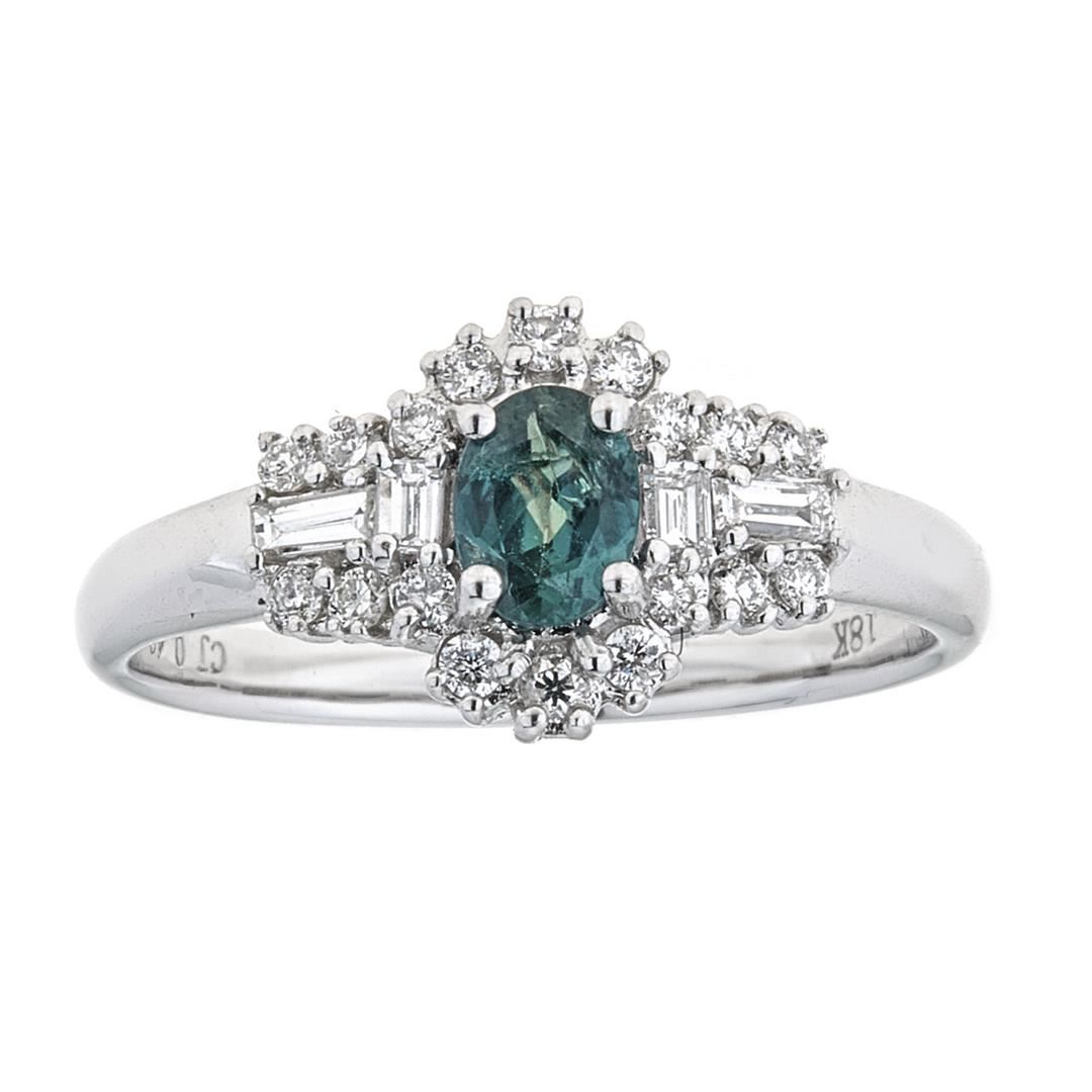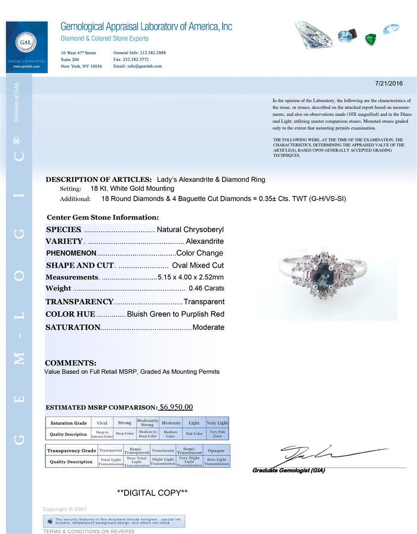 One Lady's Alexandrite and Diamond Ring. Setting: 18 Kt. White Gold Mounting. Additional: 18 Round Diamonds and 4 Baguette Cut Diamonds = 0.35 Cts. TWT (G-H/VS-SI). Center Gem Stone Information: Species: Natural Chrysoberyl. Variety: Alexandrite. Phenomenon: Color Change. Shape and Cut: Oval Mixed Cut. Measurements: 5.15 x 4.00 x 2.52 mm. 0.46 Carats. Transparency: Transparent. Color Hue: Bluish Green to Purplish Red. Saturation: Moderate. Total Weight: 3.19 grams.