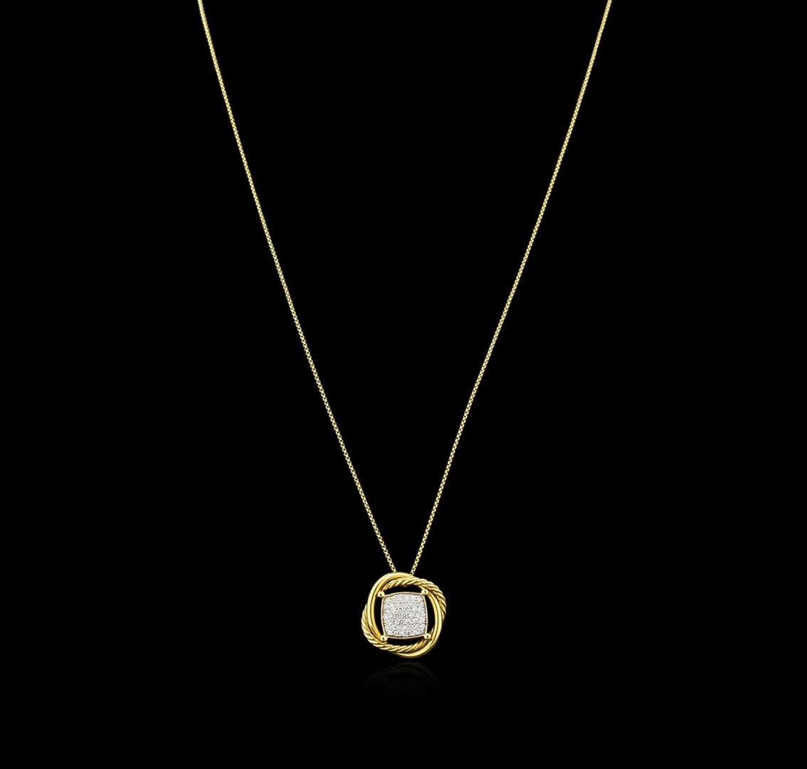 One electronically tested 18KT yellow gold lady's combination cast & assembled fashion pendant & chain 18.0" long, 1mm round cable link with a lobster claw clasp with a bright polish finish. The featured lady's pendant and chain are from the David Yurman "Infinity" collection. Trademark is D. Y. Identified with markings of "750". Condition is like new. Containing: Forty-Five pave' set round brilliant cut diamonds, measuring 1.50 - 1.30 x 0.84mm (depth est.) approximate total weight of 45 Stones = 0.46ct. Graded in the setting. Clarity: VS-1 to VS-2. Color: G - Very Good. Total Weight of Diamonds 0.46ct. Total Weight of Pendant & Chain 8.80gm. GAS Appraised at $2,950.00.