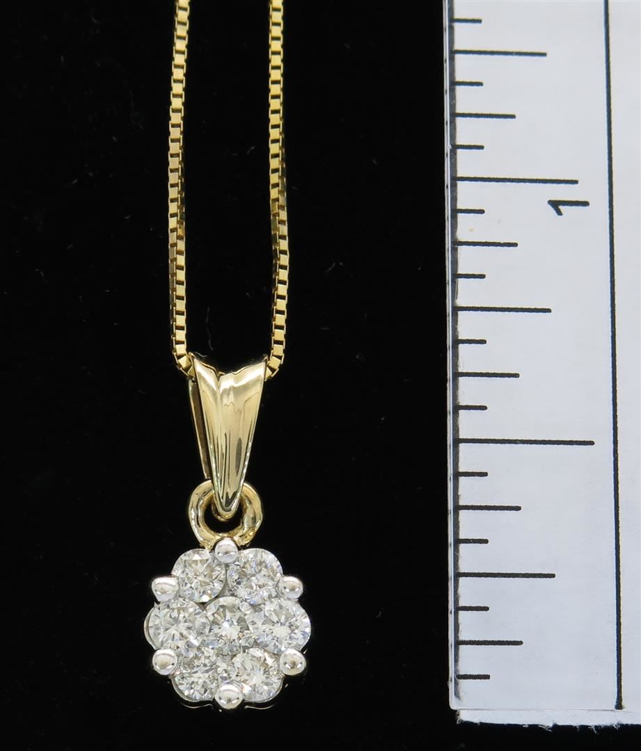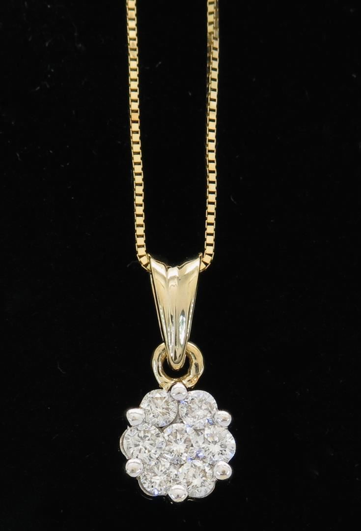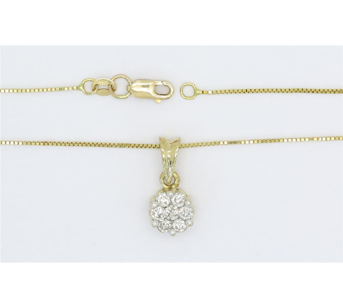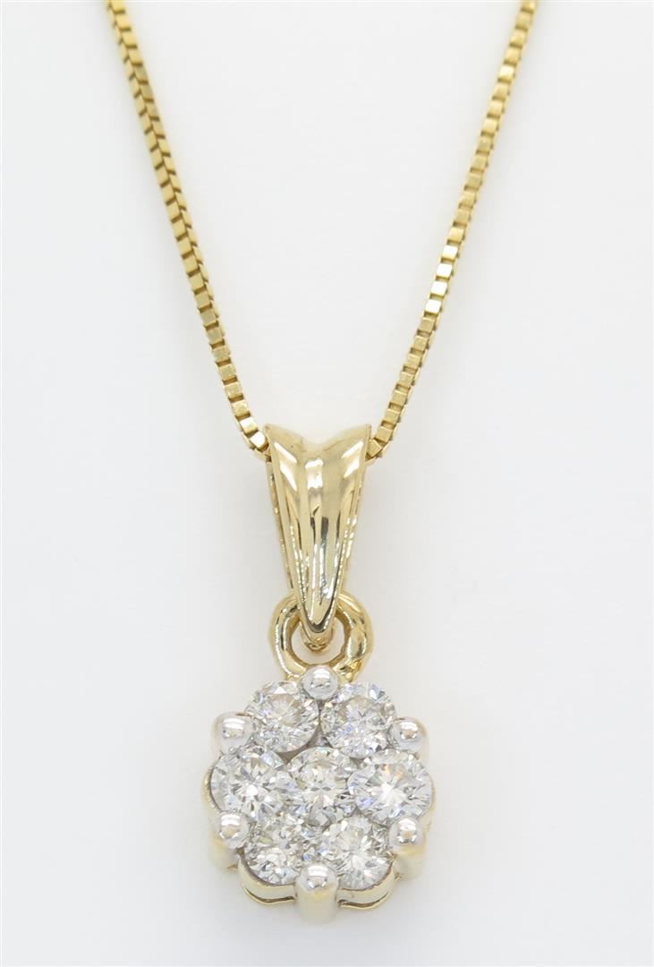 One tested 14K yellow gold diamond pendant. Containing: 7 Round Brilliant Cut Diamonds, Clarity: I, Color: G-H. Approximate total diamond weight: .46CTW. All diamonds are graded in the mounting unless otherwise stated. Weight of necklace: 3.4 grams, Chain size: 20 inches.