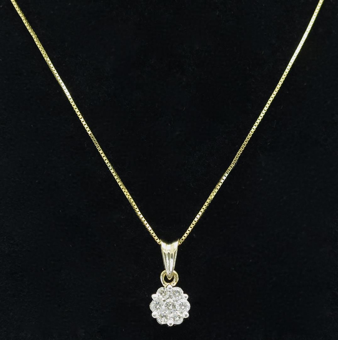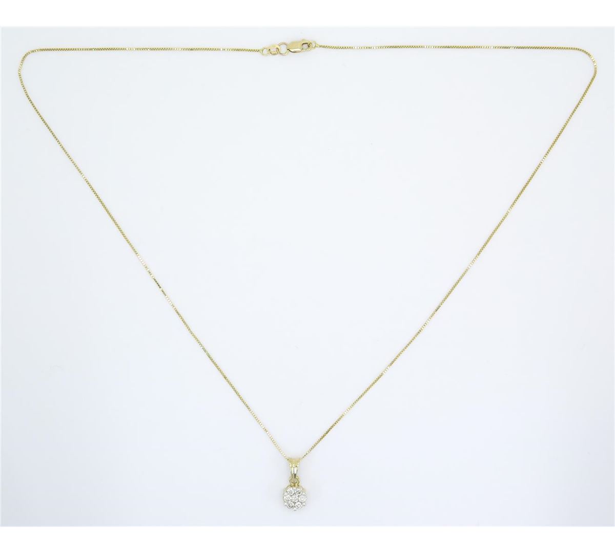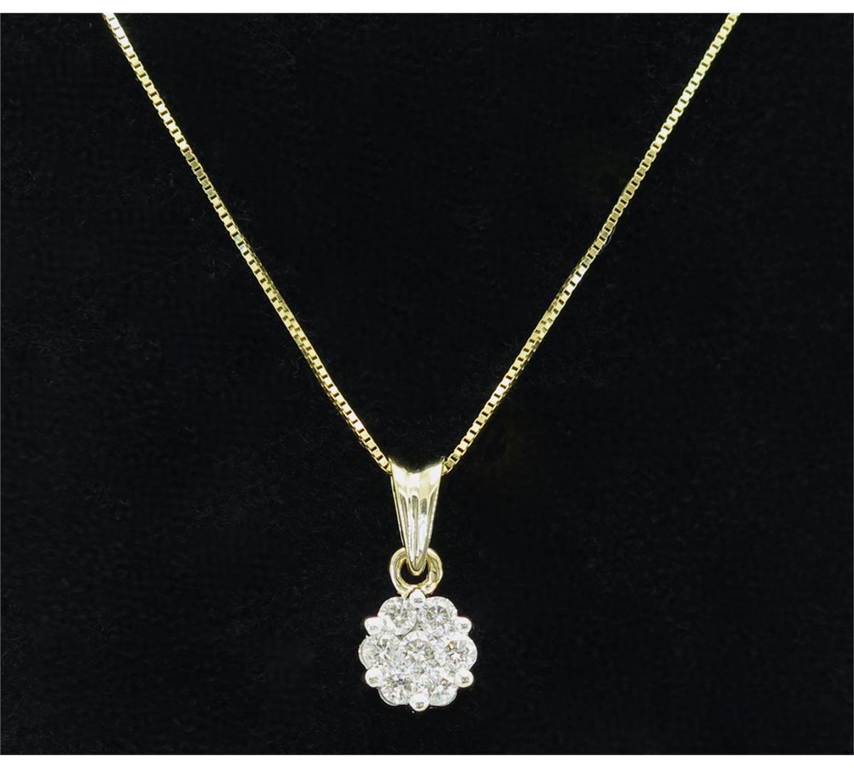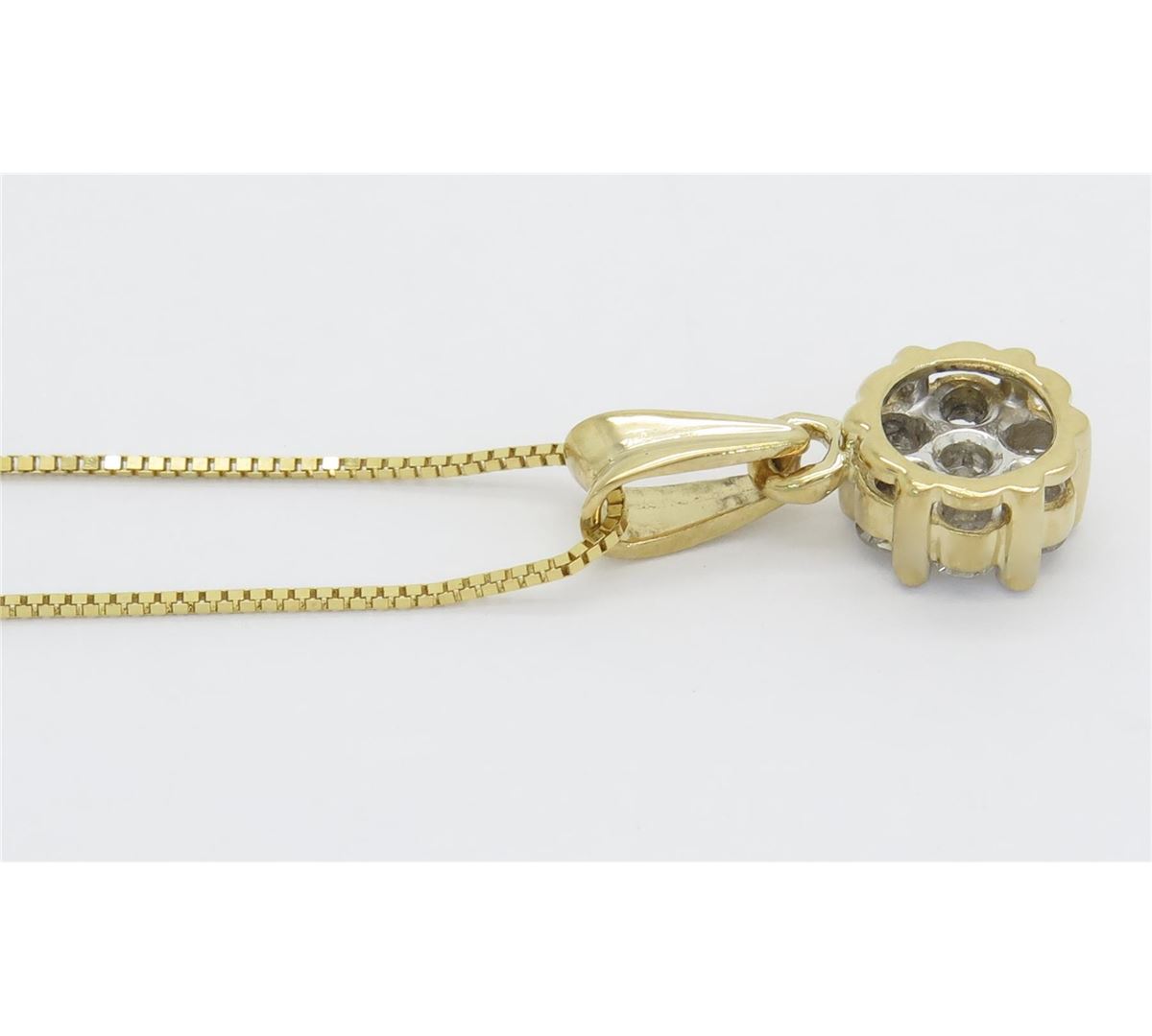 One tested 14K yellow gold diamond pendant. Containing: 7 Round Brilliant Cut Diamonds, Clarity: I, Color: G-H. Approximate total diamond weight: .46CTW. All diamonds are graded in the mounting unless otherwise stated. Weight of necklace: 3.4 grams, Chain size: 20 inches.