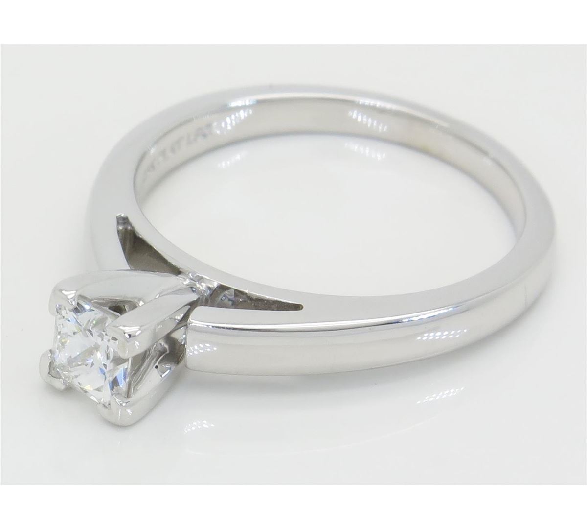 One tested 14K white gold diamond ring. Containing: One IGI Certified Leo Princess Cut Diamond. Size: .47CT, Clarity: SI2, Color: E. Diamonds are graded in the mounting, unless otherwise stated. Weight: 4.4 grams, Size: 6.75.