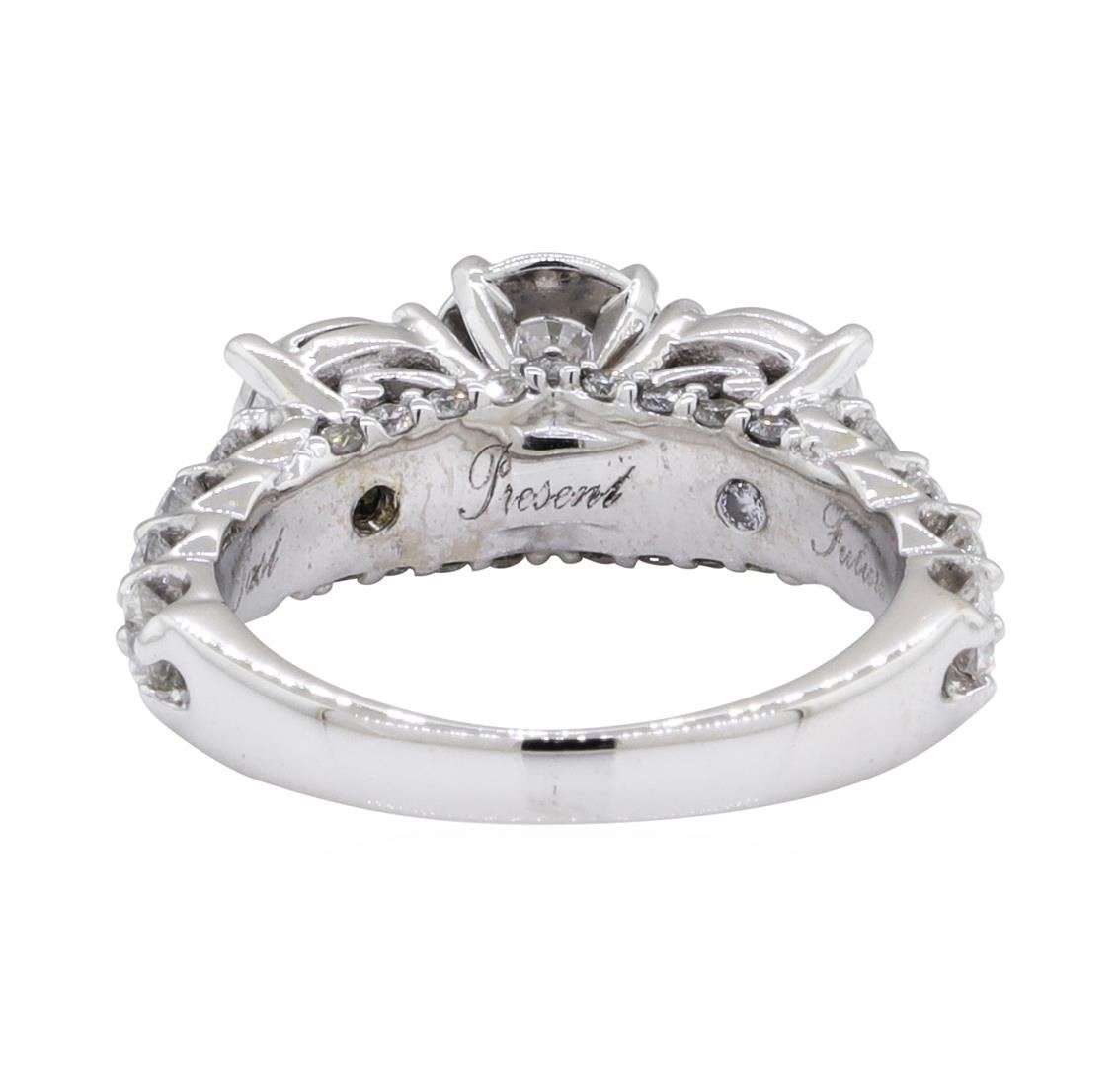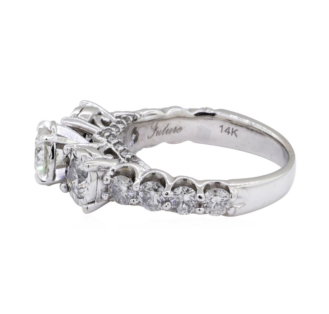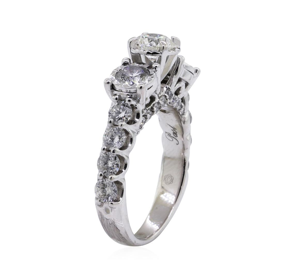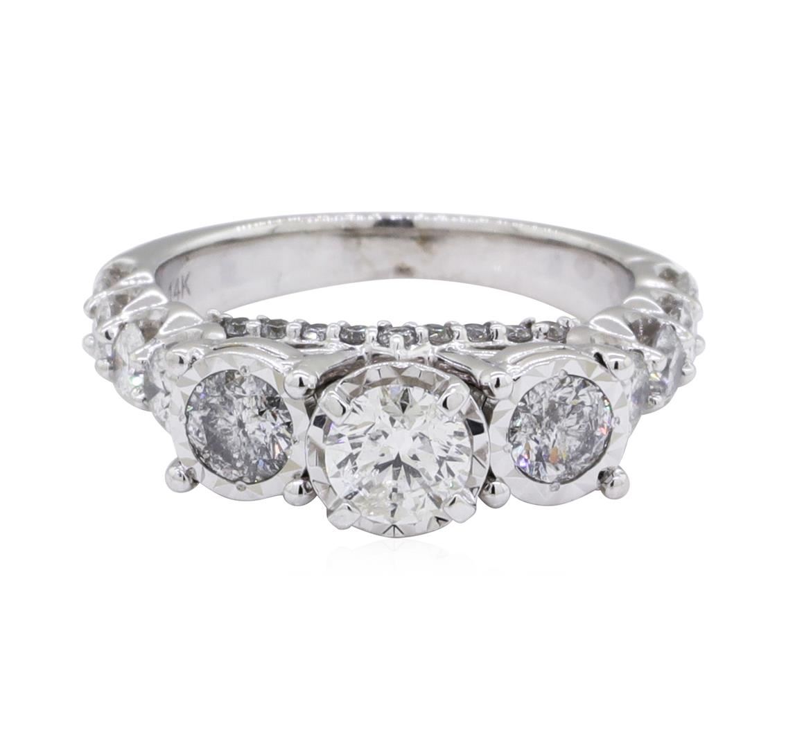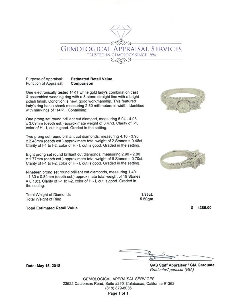 One electronically tested 14KT white gold lady's combination cast & assembled wedding ring with a 3-stone straight line with a bright polish finish. This featured lady's ring has a shank measuring 2.50 millimeters in width. Identified with markings of '14K'. Condition is new, good workmanship. Containing: One prong set round brilliant cut diamond, measuring 5.04 - 4.93 x 3.09mm (depth est.) approximate weight of 0.47ct. Graded in the setting. Color H - I Clarity I-1 Cut Good Two prong set round brilliant cut diamonds, measuring 4.10 - 3.90 x 2.48mm (depth est.) approximate total weight of 2 Stones = 0.48ct. Graded in the setting. Color H - I Clarity I-1 to I-2 Cut Good Eight prong set round brilliant cut diamonds, measuring 2.90 - 2.80 x 1.77mm (depth est.) approximate total weight of 8 Stones = 0.70ct. Graded in the setting. Color H - I Clarity I-1 to I-2 Cut Good Nineteen prong set round brilliant cut diamonds, measuring 1.40 - 1.30 x 0.84mm (depth est.) approximate total weight of 19 Stones = 0.18ct. Graded in the setting. Color H - I Clarity I-1 to I-2 Cut Good. Total Weight of Diamonds 1.83ct.. Total Weight of Ring 5.50gm GAS Appraised at $4385.00. GAS Appraised.