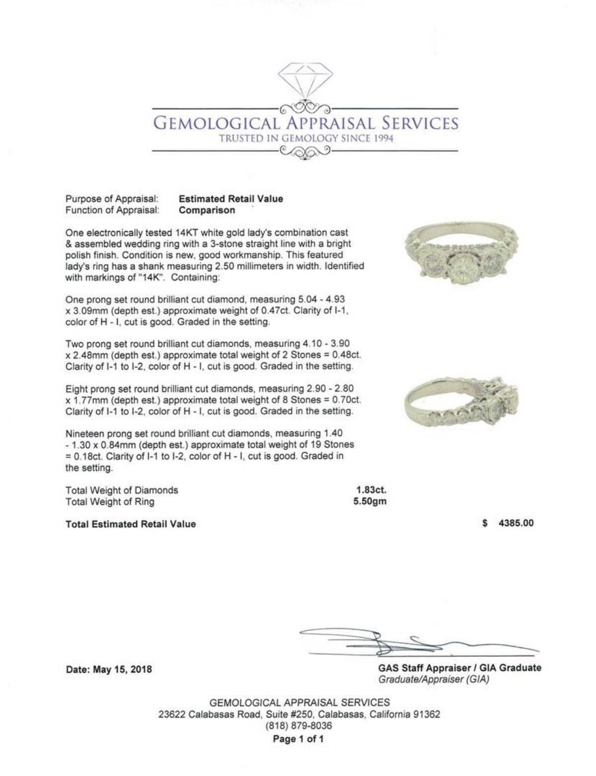 One electronically tested 14KT white gold lady's combination cast & assembled wedding ring with a 3-stone straight line with a bright polish finish. This featured lady's ring has a shank measuring 2.50 millimeters in width. Identified with markings of '14K'. Condition is new, good workmanship. Containing: One prong set round brilliant cut diamond, measuring 5.04 - 4.93 x 3.09mm (depth est.) approximate weight of 0.47ct. Graded in the setting. Color H - I Clarity I-1 Cut Good Two prong set round brilliant cut diamonds, measuring 4.10 - 3.90 x 2.48mm (depth est.) approximate total weight of 2 Stones = 0.48ct. Graded in the setting. Color H - I Clarity I-1 to I-2 Cut Good Eight prong set round brilliant cut diamonds, measuring 2.90 - 2.80 x 1.77mm (depth est.) approximate total weight of 8 Stones = 0.70ct. Graded in the setting. Color H - I Clarity I-1 to I-2 Cut Good Nineteen prong set round brilliant cut diamonds, measuring 1.40 - 1.30 x 0.84mm (depth est.) approximate total weight of 19 Stones = 0.18ct. Graded in the setting. Color H - I Clarity I-1 to I-2 Cut Good. Total Weight of Diamonds 1.83ct.. Total Weight of Ring 5.50gm GAS Appraised at $4385.00. GAS Appraised.