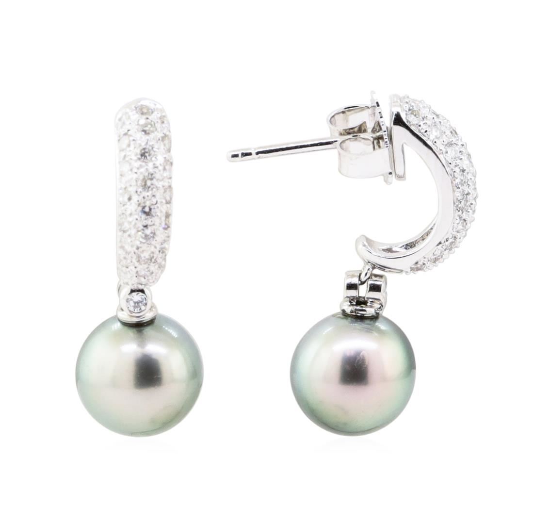 One pair electronically tested 18KT white gold lady's combination cast & assembled fashion dangle earrings with medium friction backs with a bright polish finish. The featured lady's earrings have a dangle measuring approximately 25 millimeters. Identified with markings of '18K 750'. Condition is new, good workmanship. Containing: Two Tahitian pearls, 9.2mm to 9.2mm in size. The pearls are black in color, green overtone with a very good luster, round, and clean with very good matching. Graded in the setting. Fifty-Eight prong set round brilliant cut diamonds, measuring 1.30 - 1.25 x 0.79mm (depth est.) approximate total weight of 58 Stones = 0.47ct. Graded in the setting. Color H - I Clarity VS-2 to SI-2 Cut Very Good. Total Weight of Diamonds 0.47ct.. Total Weight of Earrings 5.90gm GAS Appraised at $4795.00. GAS Appraised.