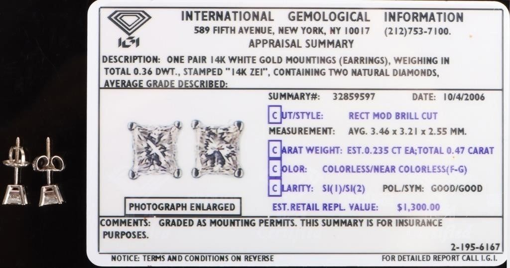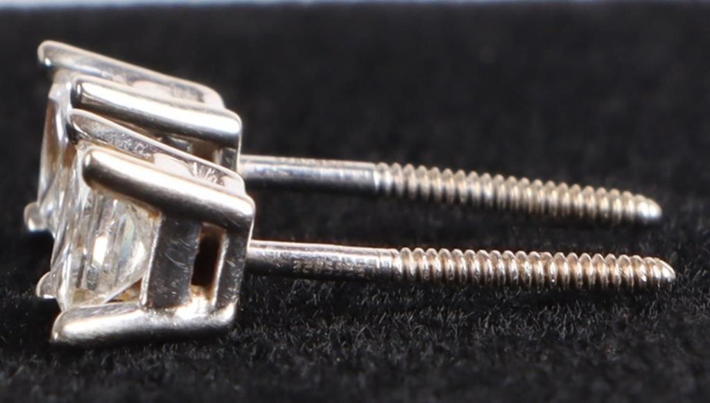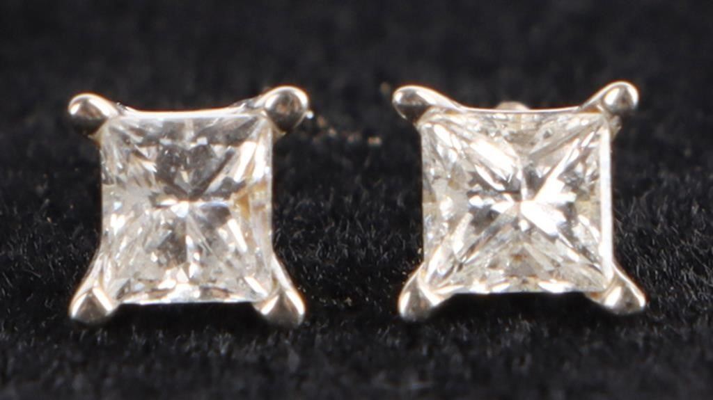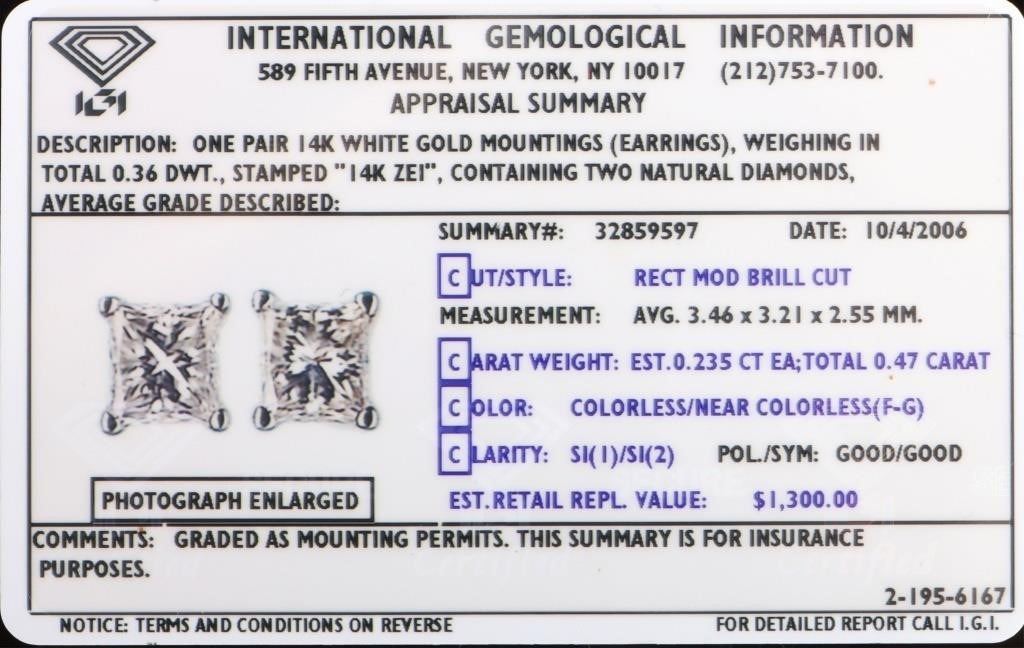 0.47CTW SI1-2 princess-cut diamond 14K white gold ladies stud earrings. Diamonds are F-G color, comes with IGI certificate.