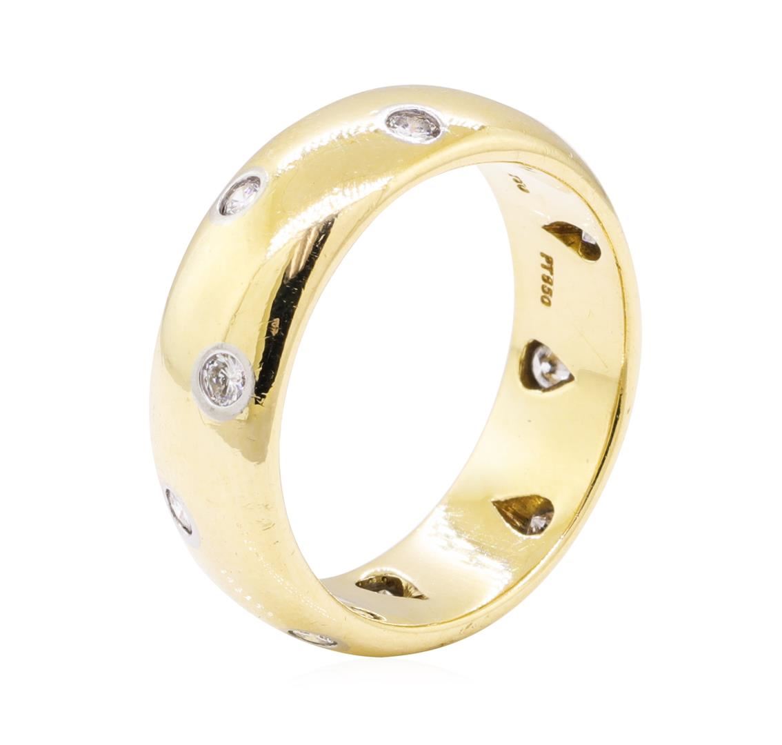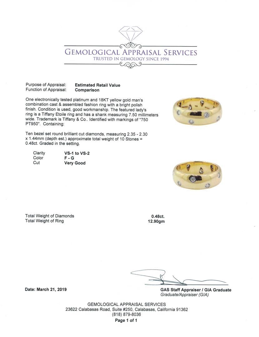 One electronically tested platinum and 18KT yellow gold man's combination cast & assembled fashion ring with a bright polish finish. The featured lady's ring is a Tiffany Etoile ring and has a shank measuring 7.50 millimeters wide. Trademark is Tiffany & Co. Identified with markings of '750 PT950'. Condition is used, good workmanship. Containing: Ten bezel set round brilliant cut diamonds, measuring 2.35 - 2.30 x 1.44mm (depth est.) approximate total weight of 10 Stones = 0.48ct. Graded in the setting. Color F - G Clarity VS-1 to VS-2 Cut Very Good. Total Weight of Diamonds 0.48ct.. Total Weight of Ring 12.90gm GAS Appraised at $2900.00. GAS Appraised at $2,900.00.