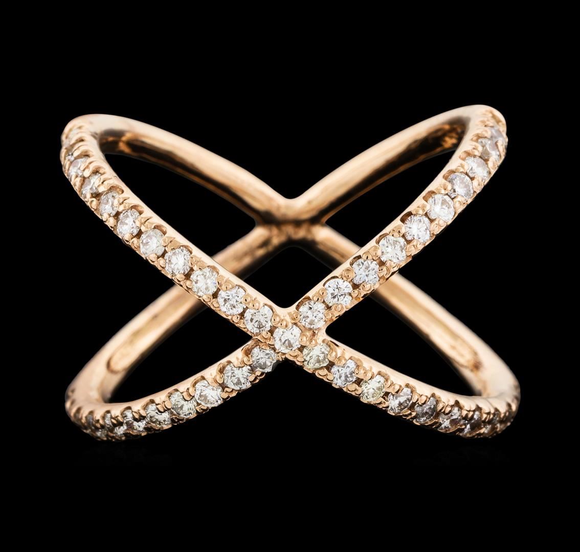 One electronically tested 14KT rose gold lady's cast fashion x ring with a split crossover shank with a bright polish finish. The featured lady's ring has a shank measuring 2.35 millimeters wide. Identified with markings of '14K'. Condition is new, good workmanship. Containing: Forty-Five prong set round brilliant cut diamonds, measuring 1.45 - 1.35 x 0.87mm (depth est.) approximate total weight of 45 Stones = 0.48ct. Graded in the setting. Clarity VS-2 to SI-1. Color: G - I Cut Good. Total Weight of Diamonds 0.48ct.. Total Weight of X Ring 4.00gm. GAS Appraised at $2,410.00.