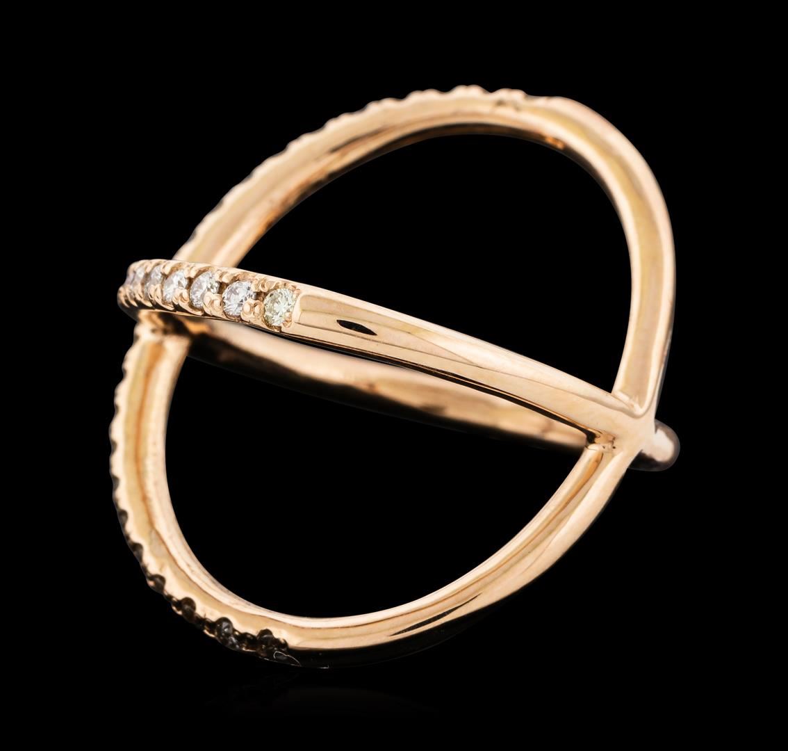 One electronically tested 14KT rose gold lady's cast fashion x ring with a split crossover shank with a bright polish finish. The featured lady's ring has a shank measuring 2.35 millimeters wide. Identified with markings of '14K'. Condition is new, good workmanship. Containing: Forty-Five prong set round brilliant cut diamonds, measuring 1.45 - 1.35 x 0.87mm (depth est.) approximate total weight of 45 Stones = 0.48ct. Graded in the setting. Clarity VS-2 to SI-1. Color: G - I Cut Good. Total Weight of Diamonds 0.48ct.. Total Weight of X Ring 4.00gm. GAS Appraised at $2,410.00.