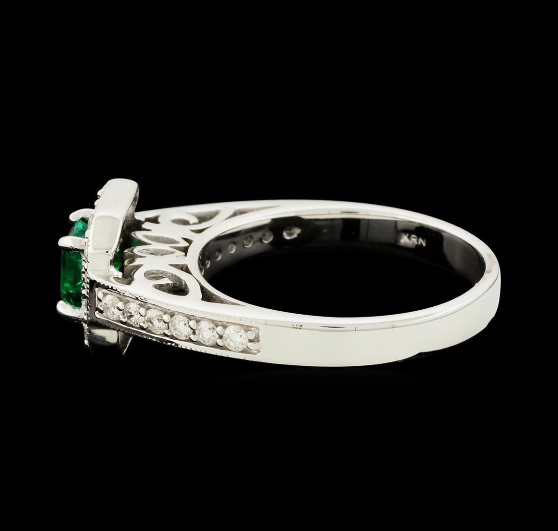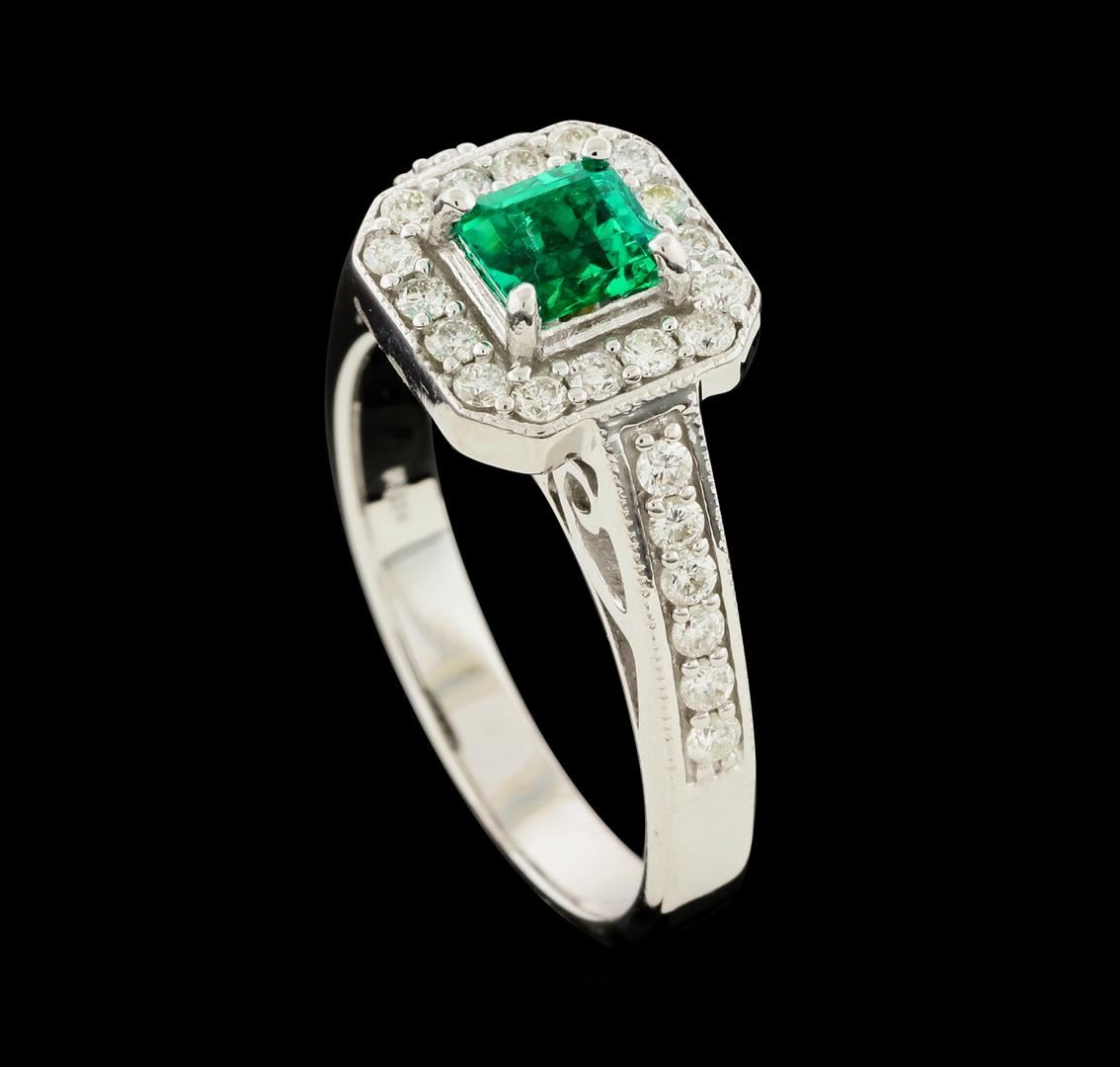 One electronically tested 14KT white gold lady's cast fashion ring with a cathedral halo with a bright polish with milgrain detailing finish. The featured lady's ring has a shank measuring 2.91 millimeters wide. Identified with markings of '14K'. Condition is new, good workmanship. Containing: One prong set emerald standard step cut natural emerald, measuring 4.96 x 4.06 x 3.00mm, (depth est.) approximate weight of 0.48ct., clarity is slightly included, medium, strong, green color, (GIA G 5/5), cut is very good. The featured emerald is slightly abraded. Transmitting light with a minimum of distortion, transparent. Colored gemstones are presumed to have been subjected to commonly used enhancement processes. Graded in the setting. Twenty-Eight prong set round brilliant cut diamonds, measuring 1.85 - 1.75 x 1.12mm (depth est.) approximate total weight of 28 Stones = 0.65ct. Graded in the setting. Clarity SI-1 to I-1. Color: H - I Cut Good. Total Weight of Colored Stones 0.48ct.. Total Weight of Diamonds 0.65ct.. Total Weight of Ring 5.60gm. GAS Appraised at $3,095.00.