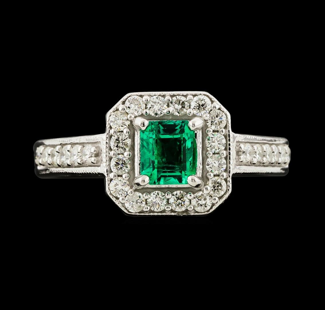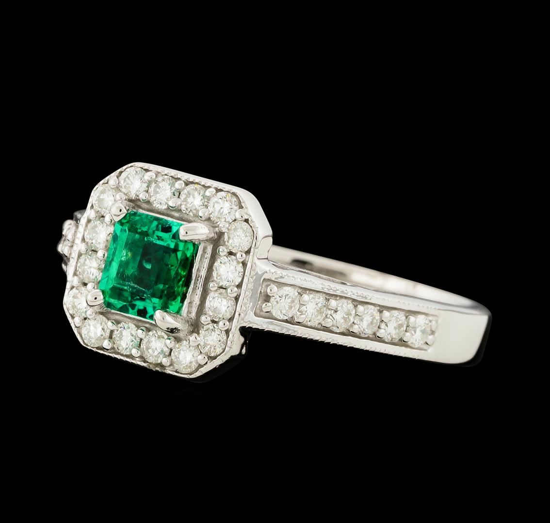 One electronically tested 14KT white gold lady's cast fashion ring with a cathedral halo with a bright polish with milgrain detailing finish. The featured lady's ring has a shank measuring 2.91 millimeters wide. Identified with markings of '14K'. Condition is new, good workmanship. Containing: One prong set emerald standard step cut natural emerald, measuring 4.96 x 4.06 x 3.00mm, (depth est.) approximate weight of 0.48ct., clarity is slightly included, medium, strong, green color, (GIA G 5/5), cut is very good. The featured emerald is slightly abraded. Transmitting light with a minimum of distortion, transparent. Colored gemstones are presumed to have been subjected to commonly used enhancement processes. Graded in the setting. Twenty-Eight prong set round brilliant cut diamonds, measuring 1.85 - 1.75 x 1.12mm (depth est.) approximate total weight of 28 Stones = 0.65ct. Graded in the setting. Clarity SI-1 to I-1. Color: H - I Cut Good. Total Weight of Colored Stones 0.48ct.. Total Weight of Diamonds 0.65ct.. Total Weight of Ring 5.60gm. GAS Appraised at $3,095.00.