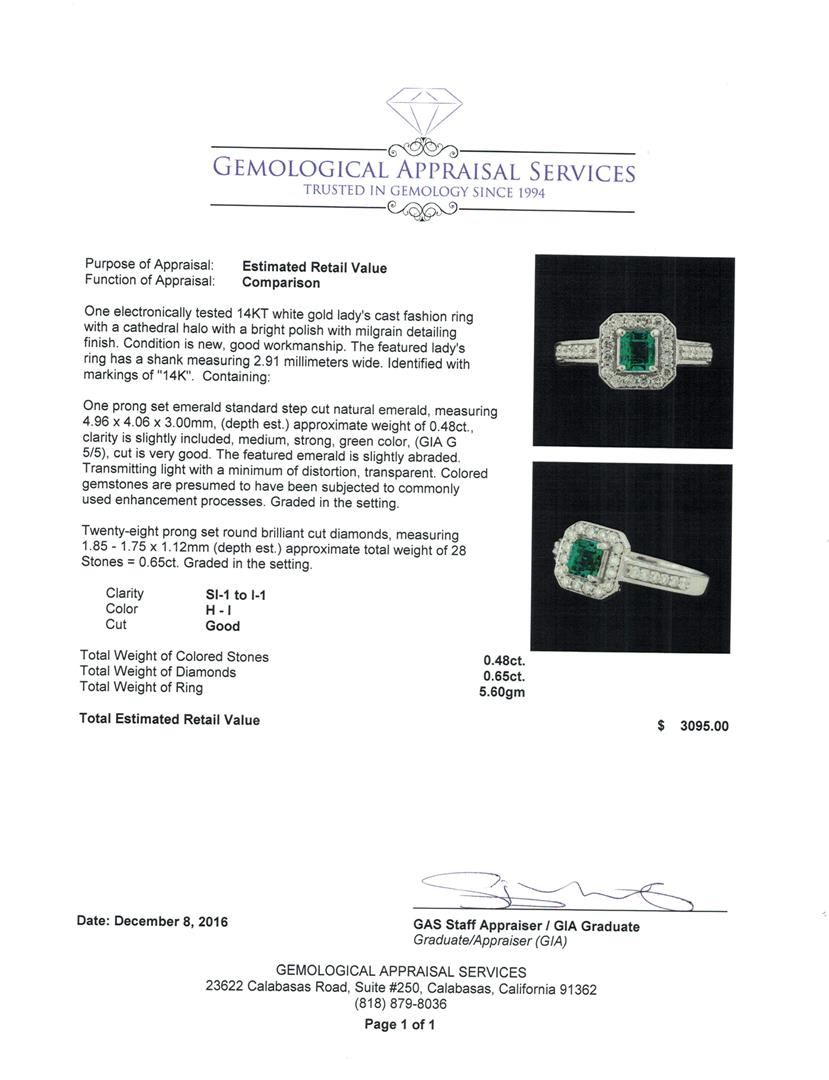 One electronically tested 14KT white gold lady's cast fashion ring with a cathedral halo with a bright polish with milgrain detailing finish. The featured lady's ring has a shank measuring 2.91 millimeters wide. Identified with markings of '14K'. Condition is new, good workmanship. Containing: One prong set emerald standard step cut natural emerald, measuring 4.96 x 4.06 x 3.00mm, (depth est.) approximate weight of 0.48ct., clarity is slightly included, medium, strong, green color, (GIA G 5/5), cut is very good. The featured emerald is slightly abraded. Transmitting light with a minimum of distortion, transparent. Colored gemstones are presumed to have been subjected to commonly used enhancement processes. Graded in the setting. Twenty-Eight prong set round brilliant cut diamonds, measuring 1.85 - 1.75 x 1.12mm (depth est.) approximate total weight of 28 Stones = 0.65ct. Graded in the setting. Clarity SI-1 to I-1. Color: H - I Cut Good. Total Weight of Colored Stones 0.48ct.. Total Weight of Diamonds 0.65ct.. Total Weight of Ring 5.60gm. GAS Appraised at $3,095.00.