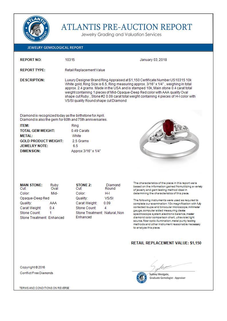 REF-17H3A -10315 ---- 0.49 CTW Ruby & Diamond Ring Solid 10K White Gold ---- Luxury Designer Brand Ring Appraised at $1,150 Certificate Number US10315 10k White gold, Ring Size is 6.5, Ring measuring approx. 3/16" x 1/4" , weighing in total approx. 2.4 grams. Made in the USA and is stamped 10k, Main stone 0.4 carat total weight containing 1 pieces of Mid-Opaque-Deep Red color with AAA quality Oval shape cut Ruby , Stone #2 0.09 carat total weight containing 4 pieces of H-I color with VS/SI quality Round shape cut Diamond