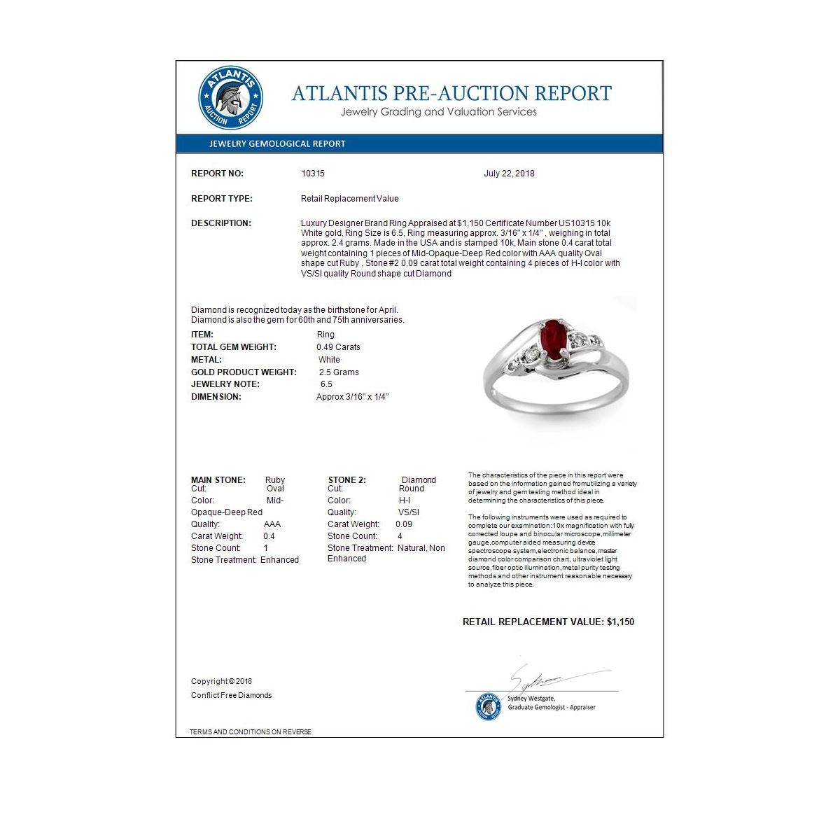 REF-17H3A -10315 ---- 0.49 CTW Ruby & Diamond Ring Solid 10K White Gold ---- Luxury Designer Brand Ring Appraised at $1,150 Certificate Number US10315 10k White gold, Ring Size is 6.5, Ring measuring approx. 3/16" x 1/4" , weighing in total approx. 2.4 grams. Made in the USA and is stamped 10k, Main stone 0.4 carat total weight containing 1 pieces of Mid-Opaque-Deep Red color with AAA quality Oval shape cut Ruby , Stone #2 0.09 carat total weight containing 4 pieces of H-I color with VS/SI quality Round shape cut Diamond