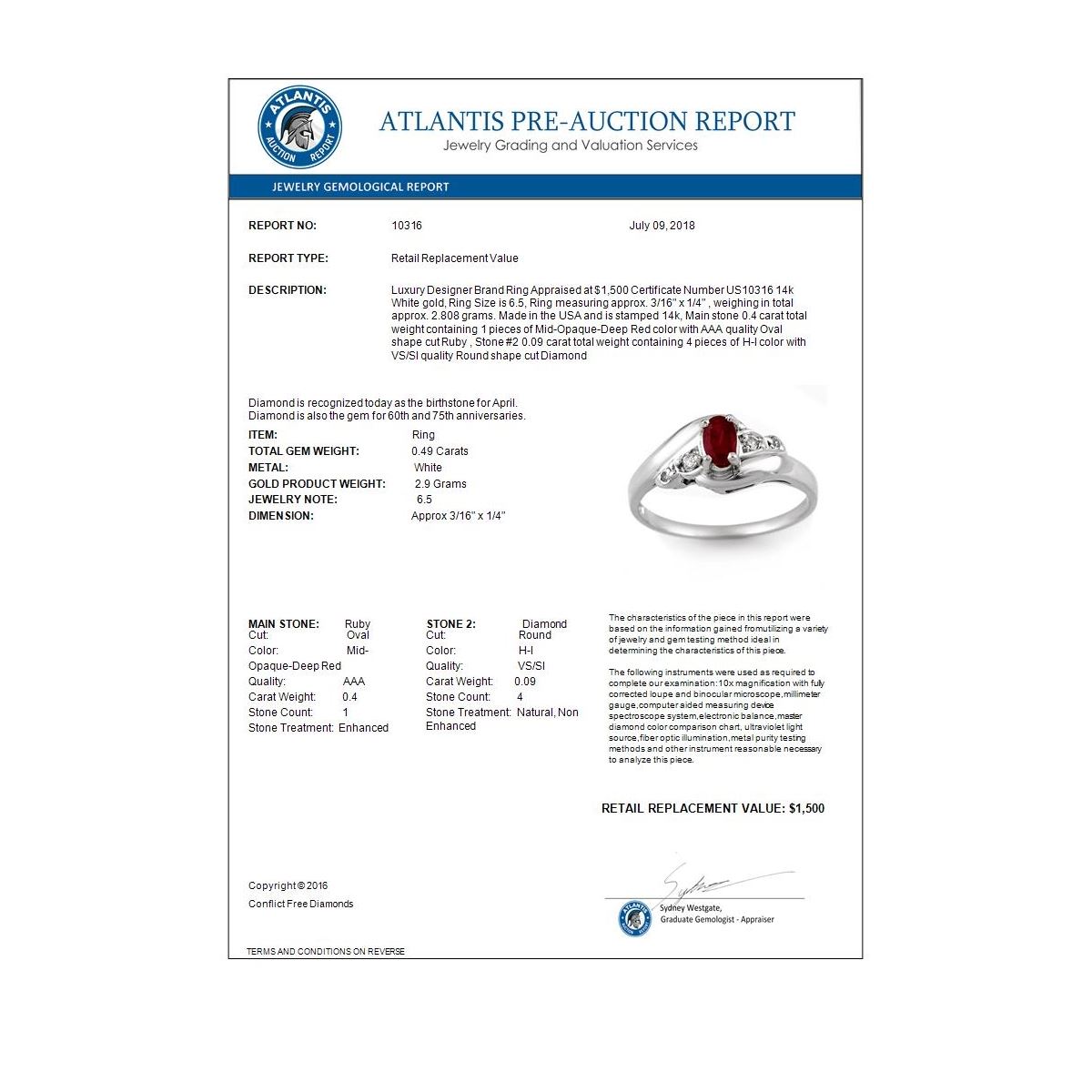 REF-22T8M -10316 ---- 0.49 CTW Ruby & Diamond Ring Solid 14K White Gold ---- Luxury Designer Brand Ring Appraised at $1,500 Certificate Number US10316 14k White gold, Ring Size is 6.5, Ring measuring approx. 3/16" x 1/4" , weighing in total approx. 2.808 grams. Made in the USA and is stamped 14k, Main stone 0.4 carat total weight containing 1 pieces of Mid-Opaque-Deep Red color with AAA quality Oval shape cut Ruby , Stone #2 0.09 carat total weight containing 4 pieces of H-I color with VS/SI quality Round shape cut Diamond