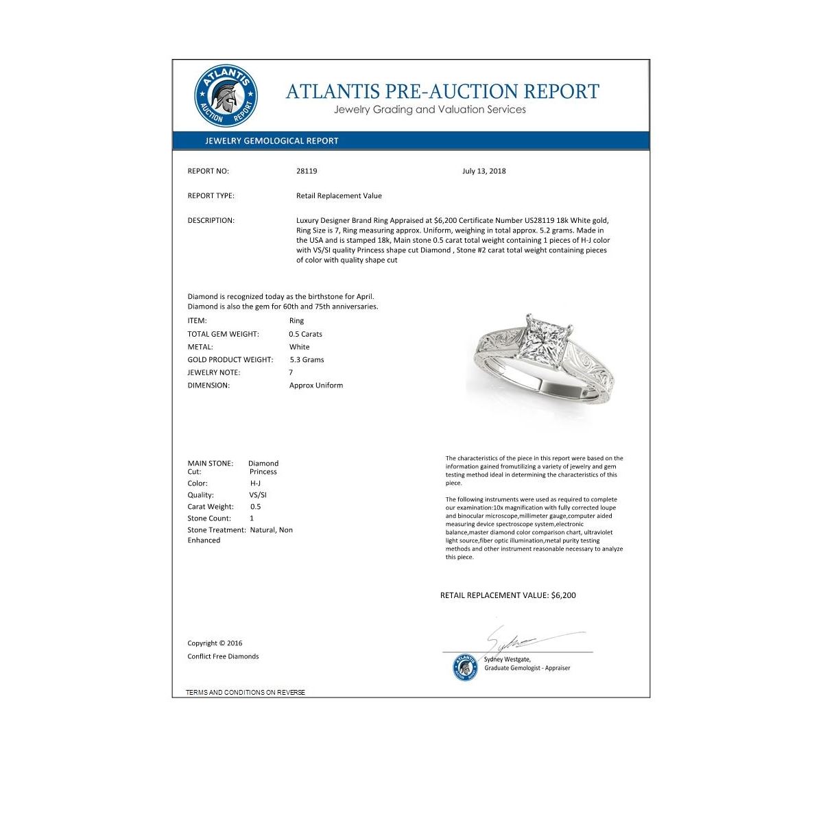 REF-125W3F -28119 ---- 0.5 CTW Certified VS/SI Princess Diamond Ring 18K White Gold ---- Luxury Designer Brand Ring Appraised at $6,200 Certificate Number US28119 18k White gold, Ring Size is 7, Ring measuring approx. Uniform, weighing in total approx. 5.2 grams. Made in the USA and is stamped 18k, Main stone 0.5 carat total weight containing 1 pieces of H-J color with VS/SI quality Princess shape cut Diamond , Stone #2 carat total weight containing pieces of color with quality shape cut