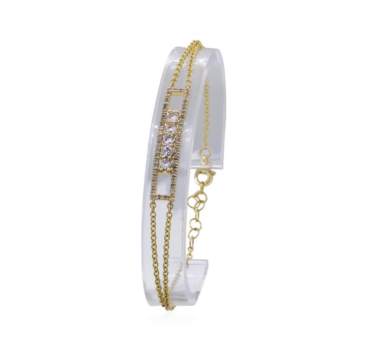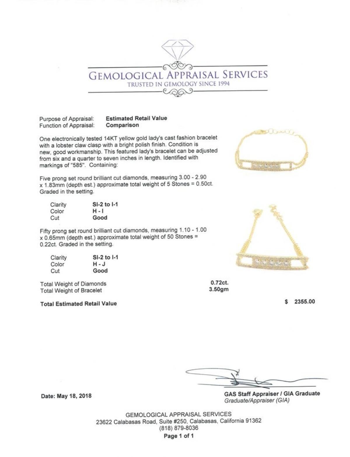 One electronically tested 14KT yellow gold lady's cast fashion bracelet with a lobster claw clasp with a bright polish finish. This featured lady's bracelet can be adjusted from six and a quarter to seven inches in length. Identified with markings of '585'. Condition is new, good workmanship. Containing: Five prong set round brilliant cut diamonds, measuring 3.00 - 2.90 x 1.83mm (depth est.) approximate total weight of 5 Stones = 0.50ct. Graded in the setting. Color H - I Clarity SI-2 to I-1 Cut Good Fifty prong set round brilliant cut diamonds, measuring 1.10 - 1.00 x 0.65mm (depth est.) approximate total weight of 50 Stones = 0.22ct. Graded in the setting. Color H - J Clarity SI-2 to I-1 Cut Good. Total Weight of Diamonds 0.72ct.. Total Weight of Bracelet 3.50gm GAS Appraised at $2355.00. GAS Appraised.