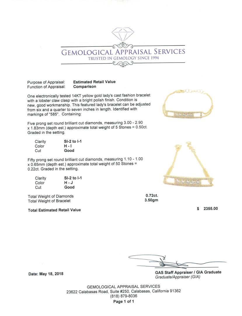 One electronically tested 14KT yellow gold lady's cast fashion bracelet with a lobster claw clasp with a bright polish finish. This featured lady's bracelet can be adjusted from six and a quarter to seven inches in length. Identified with markings of '585'. Condition is new, good workmanship. Containing: Five prong set round brilliant cut diamonds, measuring 3.00 - 2.90 x 1.83mm (depth est.) approximate total weight of 5 Stones = 0.50ct. Graded in the setting. Color H - I Clarity SI-2 to I-1 Cut Good Fifty prong set round brilliant cut diamonds, measuring 1.10 - 1.00 x 0.65mm (depth est.) approximate total weight of 50 Stones = 0.22ct. Graded in the setting. Color H - J Clarity SI-2 to I-1 Cut Good. Total Weight of Diamonds 0.72ct.. Total Weight of Bracelet 3.50gm GAS Appraised at  $2355.00. GAS Appraised.