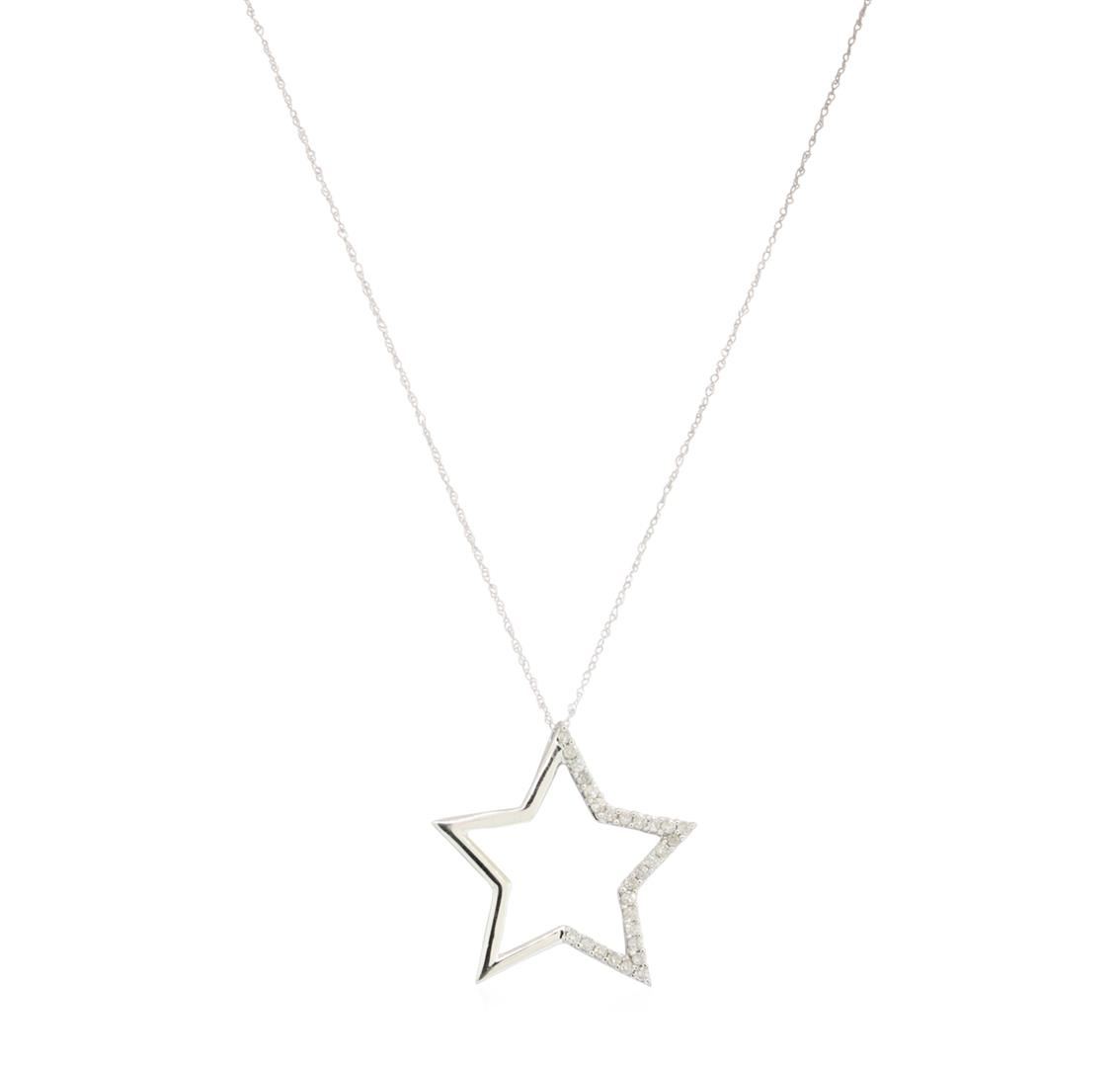 One lady's pendant with chain featuring: 10KT white gold weighing 2.5 grams containing diamonds weighing 0.50ctw. The pendant has a chain measuring approximately eighteen inches in length.