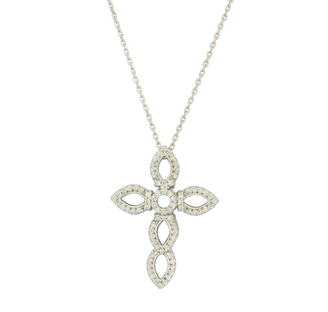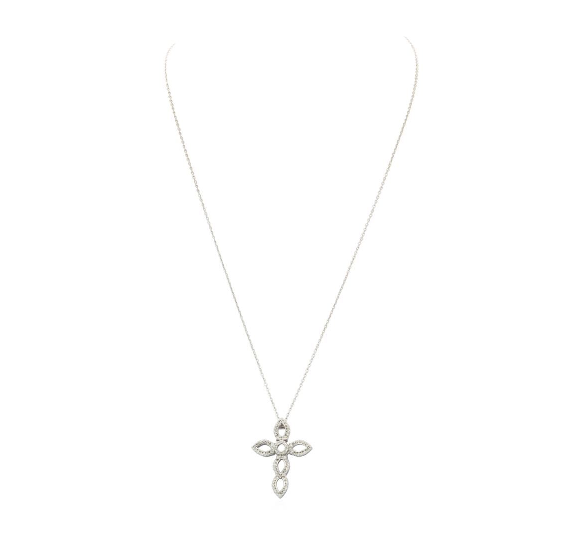 One lady's cross pendant with chain featuring: 10KT and 18KT white gold weighing 4.3 grams containing diamonds weighing 0.50ctw. The pendant has a chain measuring approximately eighteen inches in length.