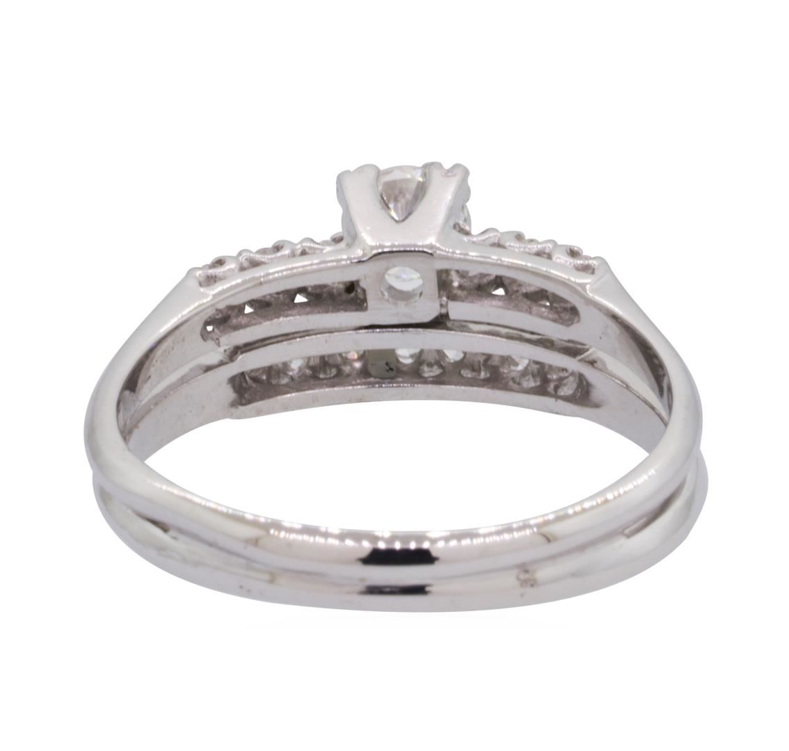 One lady's wedding ring soldered to a wedding band featuring: 14KT white gold weighing 3.5 grams containing diamonds weighing 0.50ctw.