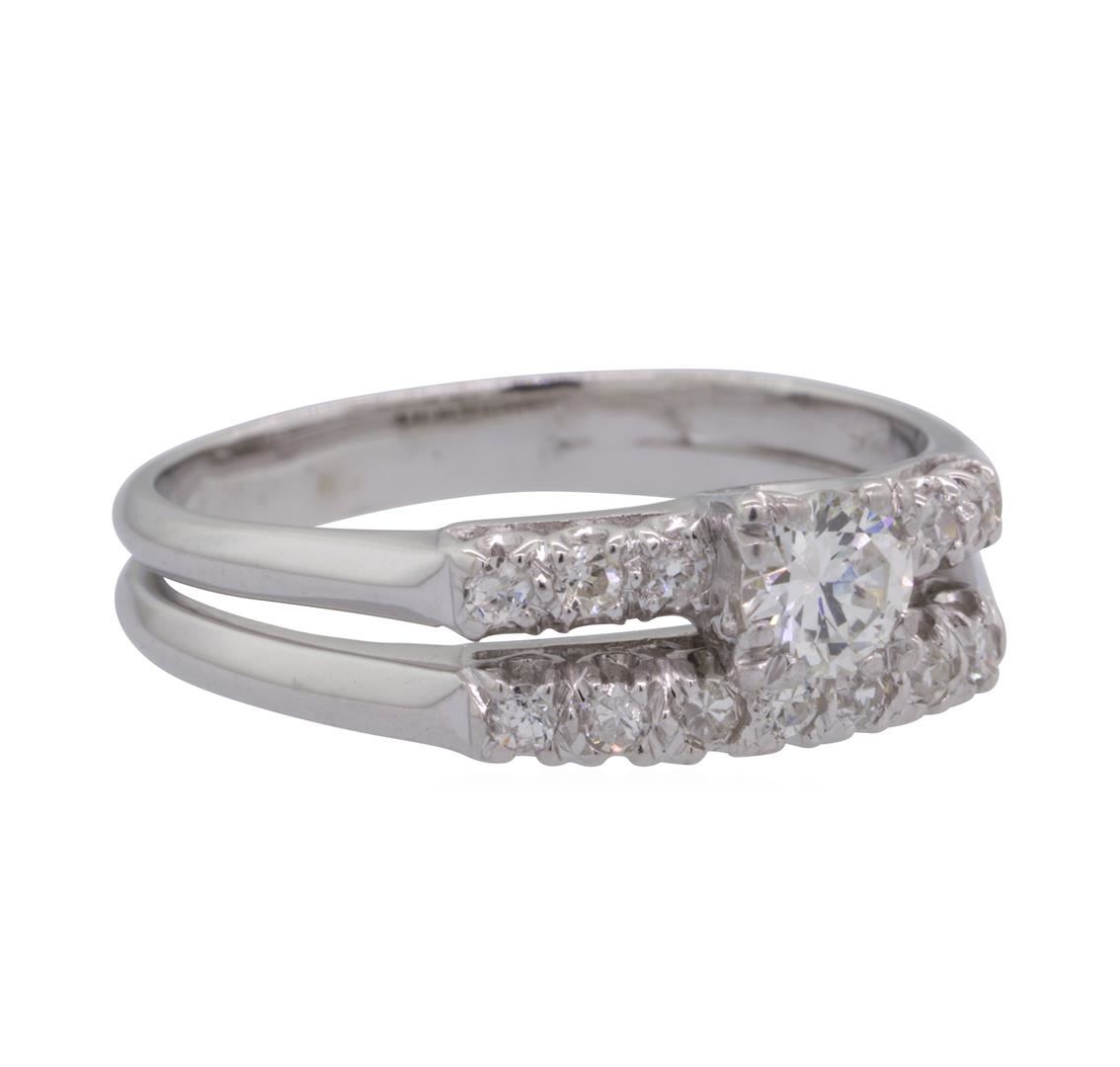 One lady's wedding ring soldered to a wedding band featuring: 14KT white gold weighing 3.5 grams containing diamonds weighing 0.50ctw.