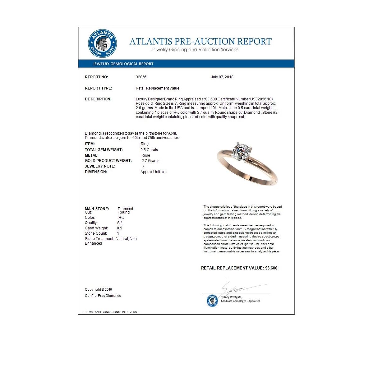REF-65T5M -32856 ---- 0.50 CTW Certified H-SI/I Quality Diamond Solitaire Engagement Ring 10K Rose Gold ---- Luxury Designer Brand Ring Appraised at $3,600 Certificate Number US32856 10k Rose gold, Ring Size is 7, Ring measuring approx. Uniform, weighing in total approx. 2.6 grams. Made in the USA and is stamped 10k, Main stone 0.5 carat total weight containing 1 pieces of H-J color with SI/I quality Round shape cut Diamond , Stone #2 carat total weight containing pieces of color with quality shape cut
