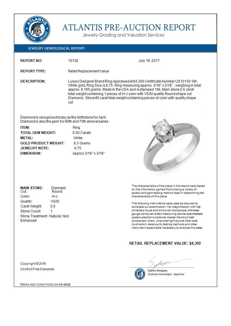 0.50 CTW Certified VS/SI Diamond Ring 18K White Gold ---- Luxury Designer Brand Ring Appraised Retail Price at $4,300 ---- SKU Number US10130 18k White gold Ring Size is 6.75, Ring measuring approx. 3/16'' x 3/16" , weighing in total approx. 6.165 grams. Made in the USA and is stamped 18k, Main stone 0.5 carat total weight containing 1 pieces of H-J color with VS/SI quality Round shape cut Diamond , Stone #2 carat total weight containing pieces of color with quality shape cut