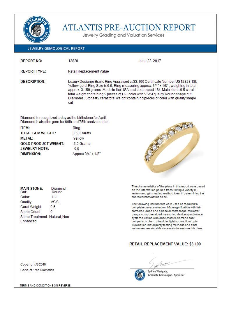 0.50 CTW Certified VS/SI Diamond Ring 18K Yellow Gold ---- Luxury Designer Brand Ring Appraised Retail Price at $3,100 ---- SKU Number US12828 18k Yellow gold Ring Size is 6.5, Ring measuring approx. 3/4" x 1/8" , weighing in total approx. 3.159 grams. Made in the USA and is stamped 18k, Main stone 0.5 carat total weight containing 9 pieces of H-J color with VS/SI quality Round shape cut Diamond , Stone #2 carat total weight containing pieces of color with quality shape cut