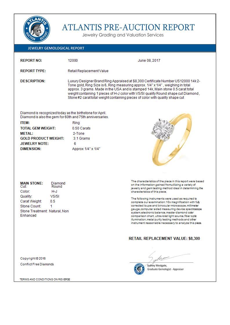 0.50 CTW Certified VS/SI Diamond Solitaire Ring 14K 2-Tone Gold ---- Luxury Designer Brand Ring Appraised Retail Price at $8,300 ---- SKU Number US12000 14k 2-Tone gold Ring Size is 6, Ring measuring approx. 1/4" x 1/4" , weighing in total approx. 3 grams. Made in the USA and is stamped 14k, Main stone 0.5 carat total weight containing 1 pieces of H-J color with VS/SI quality Round shape cut Diamond , Stone #2 carat total weight containing pieces of color with quality shape cut