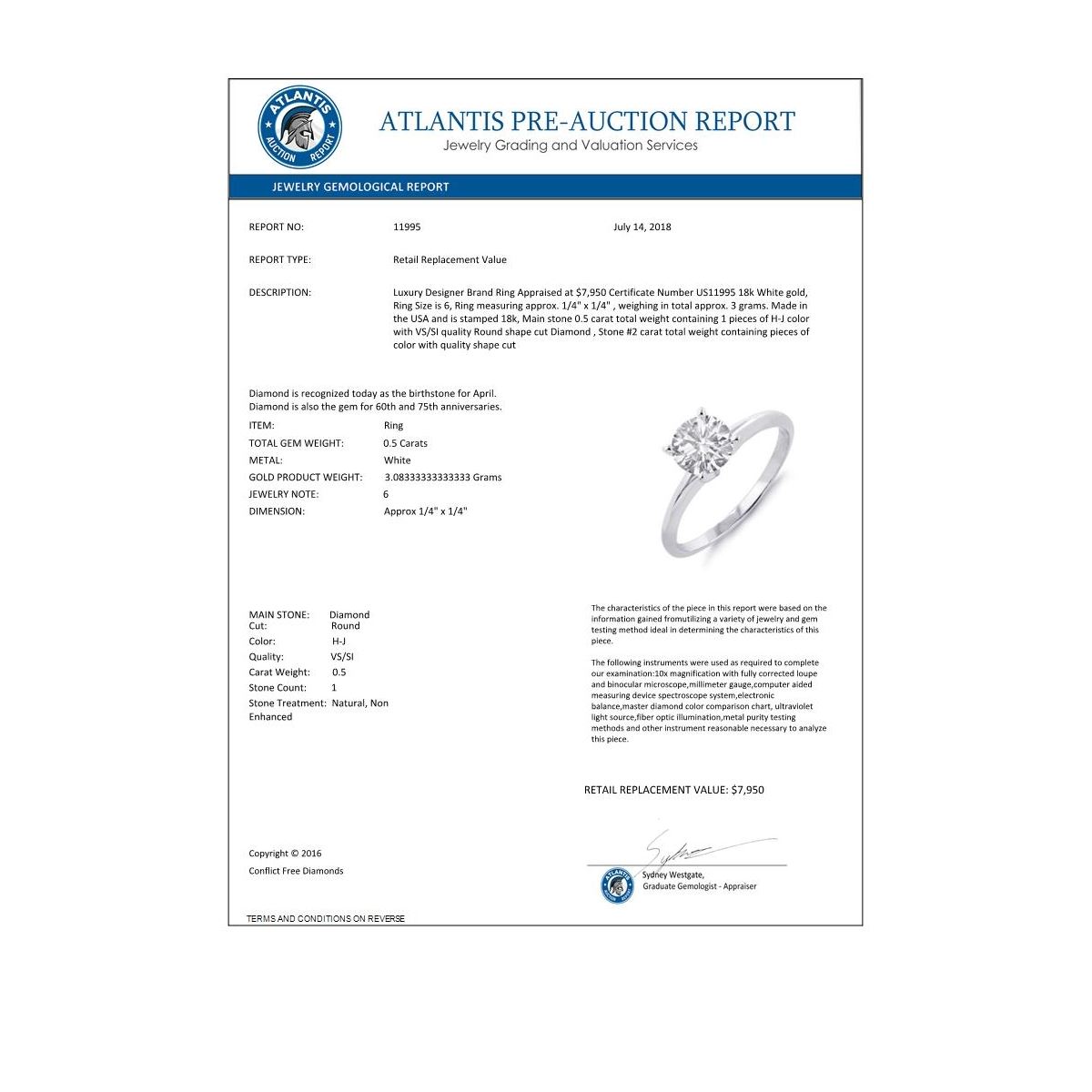 REF-160M8H -11995 ---- 0.50 CTW Certified VS/SI Diamond Solitaire Ring 18K White Gold ---- Luxury Designer Brand Ring Appraised at $7,950 Certificate Number US11995 18k White gold, Ring Size is 6, Ring measuring approx. 1/4" x 1/4" , weighing in total approx. 3 grams. Made in the USA and is stamped 18k, Main stone 0.5 carat total weight containing 1 pieces of H-J color with VS/SI quality Round shape cut Diamond , Stone #2 carat total weight containing pieces of color with quality shape cut