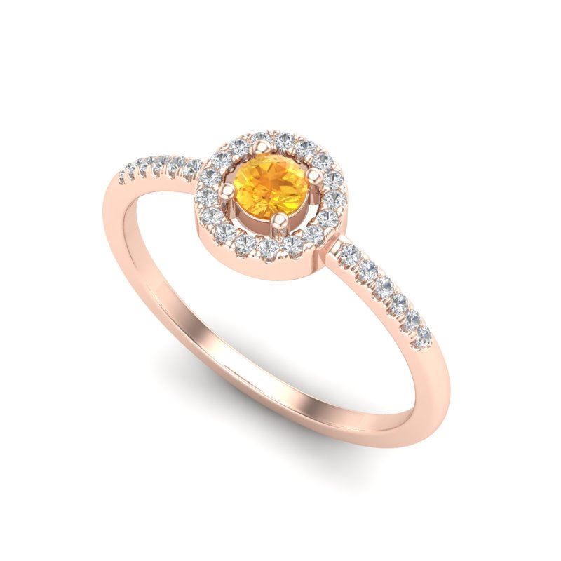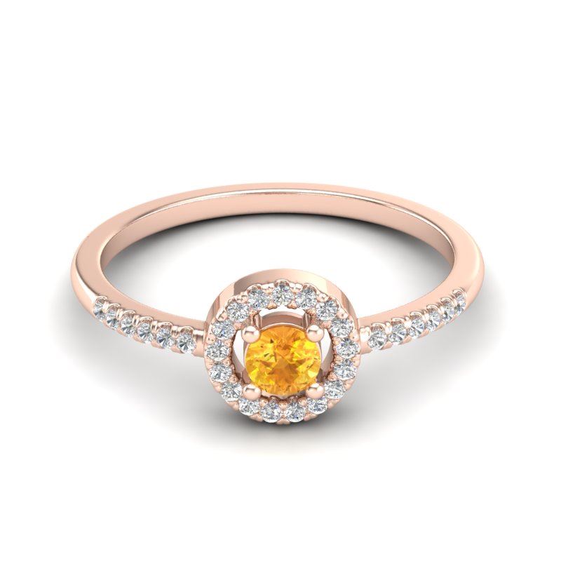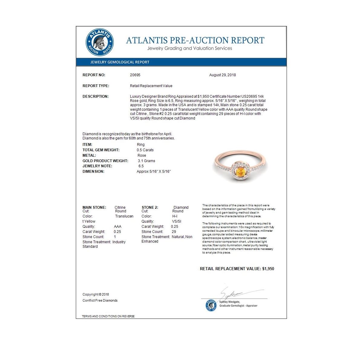 REF-31A8X -20695 ---- 0.50 CTW Citrine & Micro Pave VS/SI Diamond Ring Solitaire Halo 14K Rose Gold ---- Luxury Designer Brand Ring Appraised at $1,950 Certificate Number US20695 14k Rose gold, Ring Size is 6.5, Ring measuring approx. 5/16" X 5/16" , weighing in total approx. 3 grams. Made in the USA and is stamped 14k, Main stone 0.25 carat total weight containing 1 pieces of Translucent Yellow color with AAA quality Round shape cut Citrine , Stone #2 0.25 carat total weight containing 29 pieces of H-I color with VS/SI quality Round shape cut Diamond