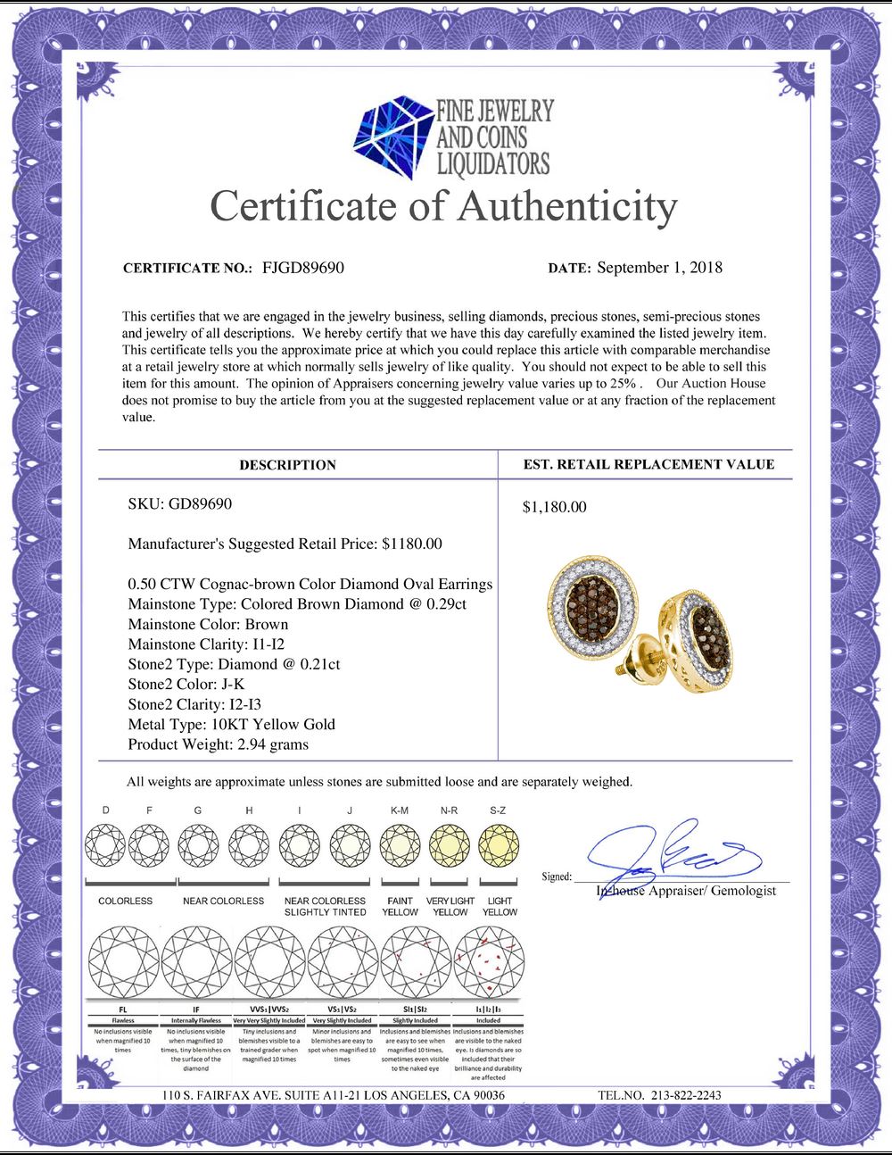 REF-30N2F- SKU: GD89690 ---- 0.50 CTWCognac-brown Color Diamond Oval Cluster Earrings 10KT Yellow Gold