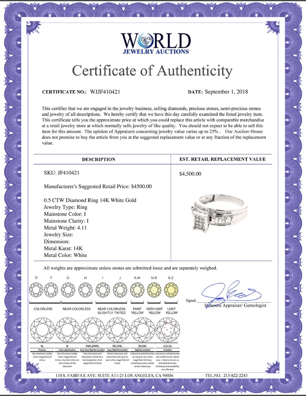 WORLD JEWELRY AUCTION believes to the best of its knowledge that the information presented in any listing has come from reliable sources. Such information is presented solely for the convenience of the Purchaser. WJA makes no warranties of any kind related to the information presented in any listing. WJA further makes no warranties, either express or implied, relating to the value, marketability or condition of the lot described in any listing. Prospective bidders should investigate a lot thoroughly before bidding. By bidding the Bidder acknowledges that Bidder has investigated the lot to his or her satisfaction, or, that Bidder has chosen not to do so, and agrees to accept the lot being bid on with no objections after the sale closes. If you are uncertain please contact us with your questions prior to bidding. If you are still uncertain after we reply, please refrain from bidding. Photos other graphic material contained in any listing of generic or duplicate lots may be stock presentations and not necessarily of the specific lot.
