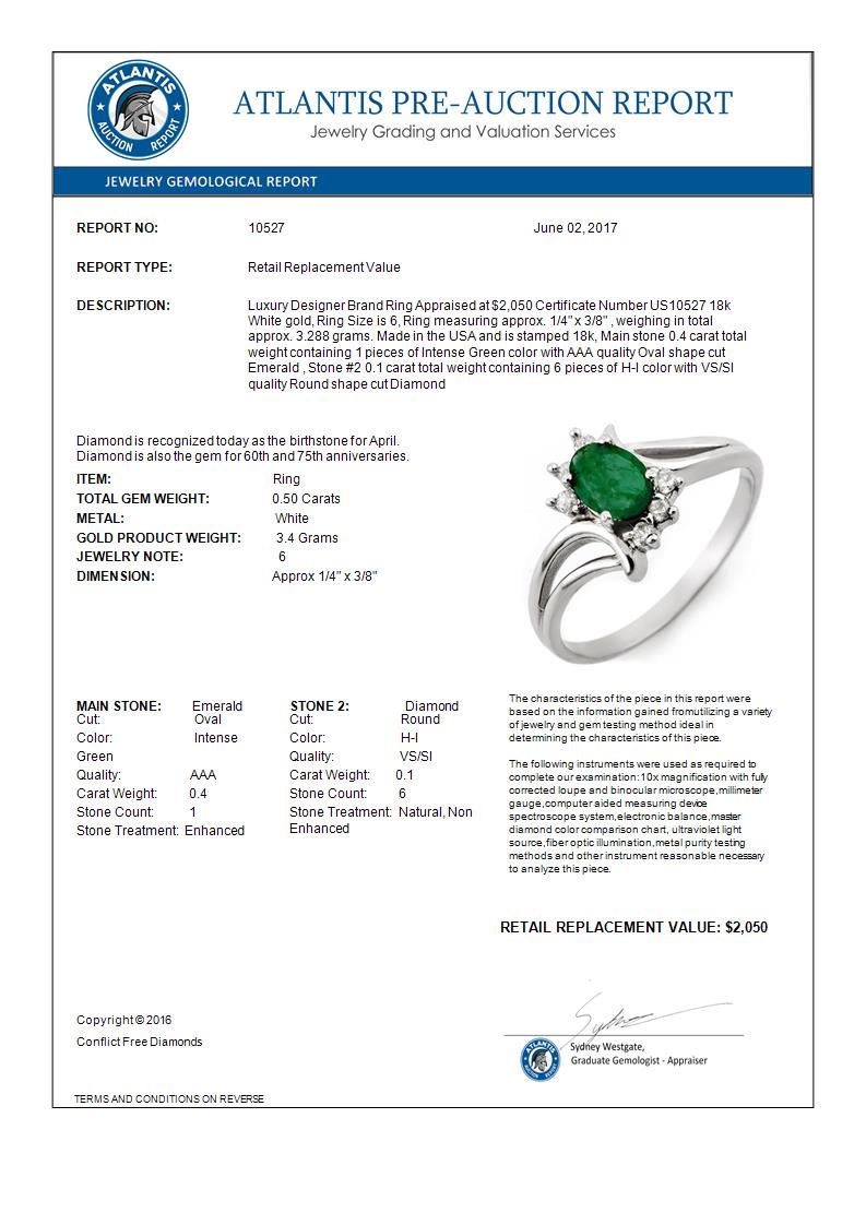 0.50 CTW Emerald & Diamond Ring 18K White Gold ---- Luxury Designer Brand Ring Appraised Retail Price at $2,050 ---- SKU Number US10527 18k White gold Ring Size is 6, Ring measuring approx. 1/4" x 3/8" , weighing in total approx. 3.288 grams. Made in the USA and is stamped 18k, Main stone 0.4 carat total weight containing 1 pieces of Intense Green color with AAA quality Oval shape cut Emerald , Stone #2 0.1 carat total weight containing 6 pieces of H-I color with VS/SI quality Round shape cut